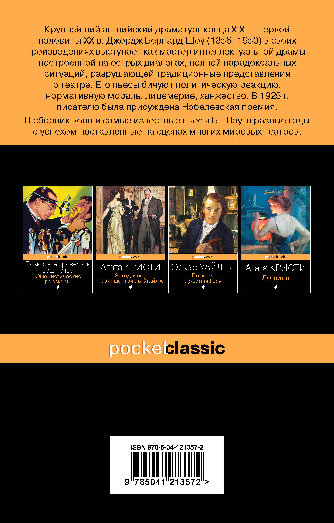 Крупнейший английский драматург конца XIX - первой половины XX в. Джордж Бернард Шоу (1856-1950) в своих произведениях выступает как мастер интеллектуальной драмы-дискуссии, построенной на острых диалогах, полной парадоксальных ситуаций, разрушающей все традиционные представления о театре. Его пьесы бичуют политическую реакцию, нормативную мораль, лицемерие, ханжество. В 1925 г. писателю была присуждена Нобелевская премия. В данный сборник вошли пьесы «Пигмалион», «Цезарь и Клеопатра» и «Дом, где разбиваются сердца», ставшие классикой театральных сцен всего мира.| Издательство | ООО "Издательство "Эксмо" |