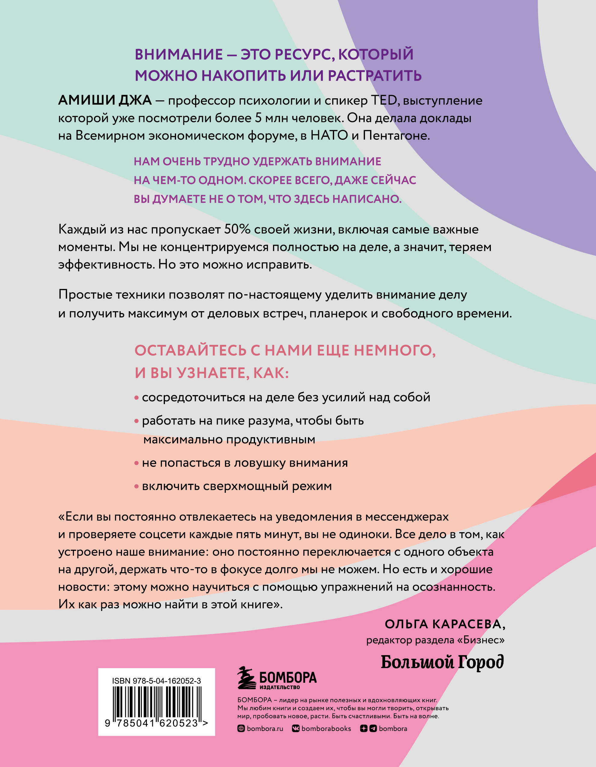 БЕСТСЕЛЛЕР AMAZON. ВХОДИТ В ТОП-100 КНИГ ПО КОГНИТИВНОЙ ПСИХОЛОГИИ. Представьте свою жизнь в виде лоскутного одеяла, в котором каждый квадратик - определенный момент. Вот вы наливаете чашку кофе, а здесь - смеетесь с друзьями. А теперь представьте, что рвете половину одеяла. Остальные воспоминания исчезли, и, скорее всего, вы этого даже не заметите. Почему? Вы просто не обращали на них внимания. Нам очень трудно удержать внимание. Скорее всего, даже сейчас, читая этот текст, вы думаете о чем-то другом и с трудом вспомните содержание предыдущего абзаца. И так во всем. Вы упускаете 50% своей жизни, включая самые важные моменты. Но есть и хорошая новость: с вами все в порядке. Человеческий мозг создан для того, чтобы его можно было отвлечь. Вы еще здесь? Есть новость еще лучше: вы можете научиться эффективно концентрировать внимание и получать максимум от деловой встречи, планерок и свободного времени. Вы выведете продуктивность на новый уровень. Оставайтесь с нами еще немного, и вы узнаете, как: • сосредоточиться на деле без больших усилий; • работать на пике разума, чтобы быть максимально продуктивным; • не попасться в ловушку внимания; • включить сверхмощный режим. ОБ АВТОРЕ Амиши Джа - профессор психологии и спикер TED, выступление которой уже посмотрели более 5 млн людей. Ее книга - бестселлер Amazon.| Издательство | ООО "Издательство "Эксмо" |