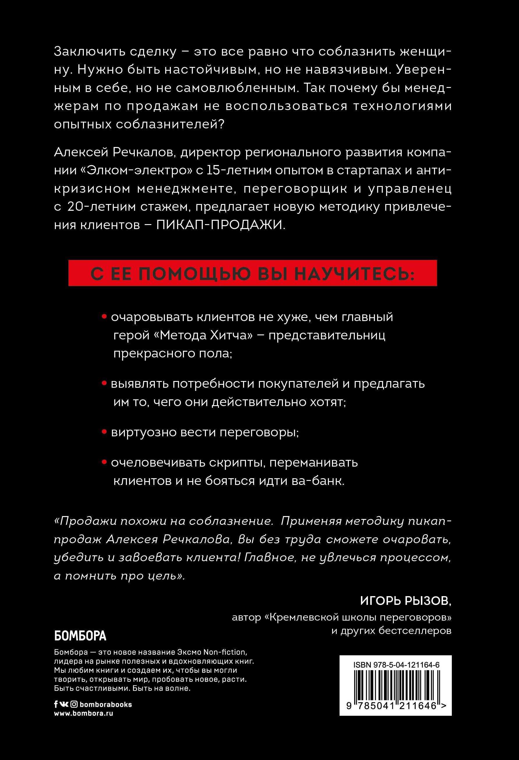 Заключить сделку - это все равно что соблазнить женщину. Нужно быть настойчивым, но не навязчивым. Уверенным в себе, но не самовлюбленным. Так почему бы менеджерам по продажам не воспользоваться технологиями опытных соблазнителей? Алексей Речкалов, директор регионального развития компании "Элком-электро" с 15-летним опытом в стартапах и антикризисном менеджменте, переговорщик и управленец с 20-летним стажем, предлагает новую методику привлечения клиентов - ПИКАП-ПРОДАЖИ. С ЕЕ ПОМОЩЬЮ ВЫ НАУЧИТЕСЬ: • очаровывать клиентов не хуже, чем главный герой "Метода Хитча" - представительниц прекрасного пола; • выявлять потребности покупателей и предлагать им то, чего они действительно хотят; • виртуозно вести переговоры; • очеловечивать скрипты, переманивать клиентов и не бояться идти ва-банк.| Издательство | ООО "Издательство "Эксмо" |