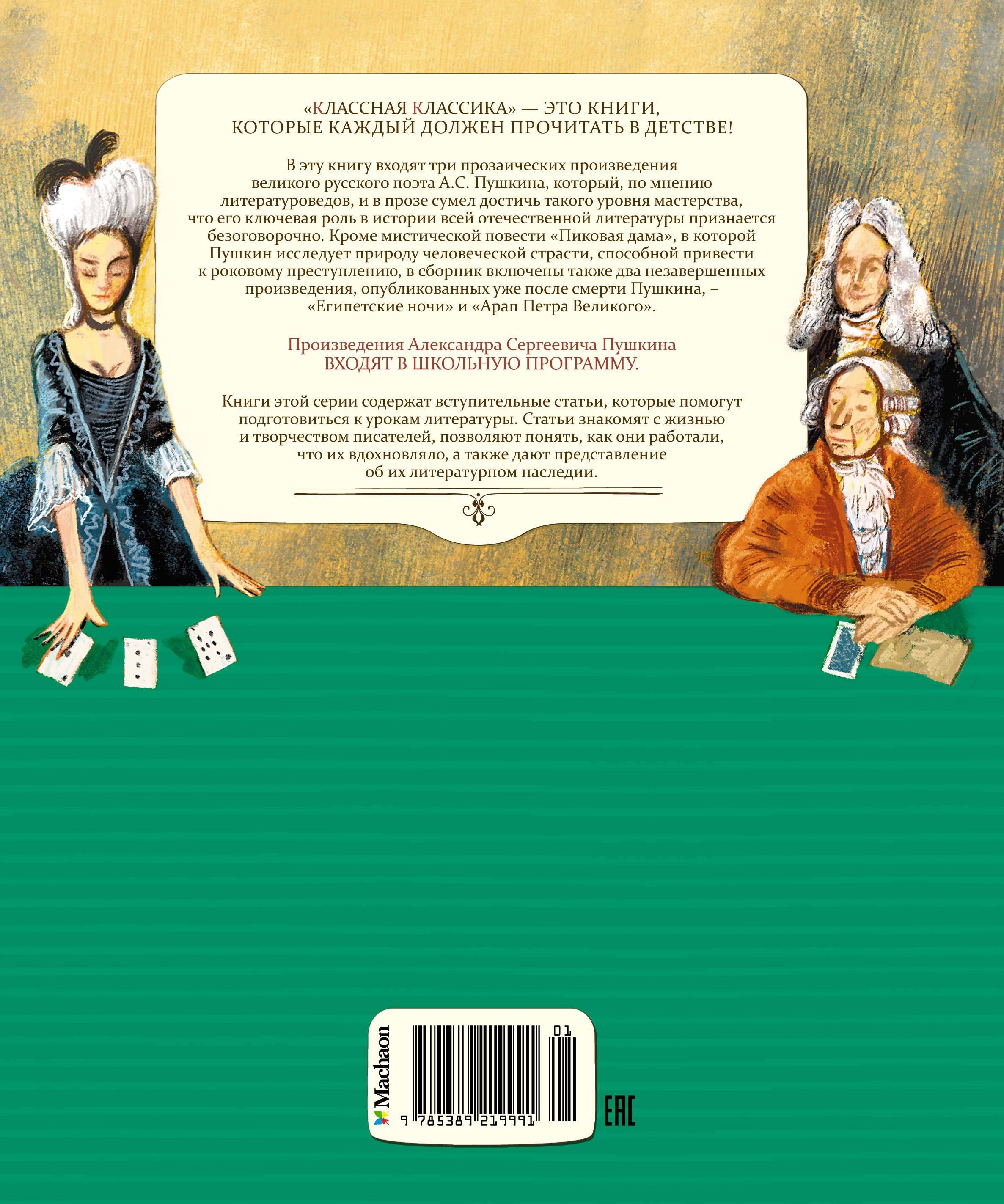 В эту книгу входят три прозаических произведения великого русского поэта А.С. Пушкина, который, по мнению литературоведов, и в прозе сумел достичь такого уровня мастерства, что его ключевая роль в истории всей отечественной литературы признается безоговорочно. Кроме мистической повести "Пиковая дама", в которой Пушкин исследует природу человеческой страсти, способной привести к роковому преступлению, в сборник включены также два незавершенных произведения, опубликованных уже после смерти Пушкина, - "Египетские ночи" и "Арап Петра Великого".| Издательство | Азбука-Аттикус Издат.группа ООО |