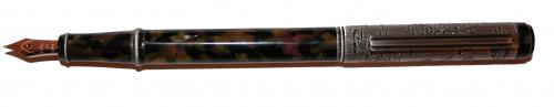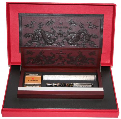 Корпус изготовлен из цветного целлюлоида. Жемчужина в рисунком рукаве показывает играющий дракон, который символизирует выгодный знак. Ручка в комплекте с коробкой.
