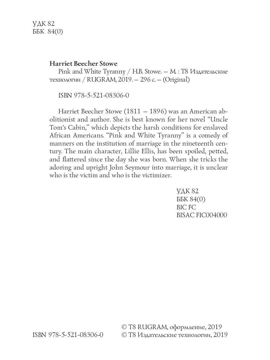 Harriet Beecher Stowe (1811 - 1896) was an American abolitionist and author. She is best known for her novel "Uncle Tom's Cabin," which depicts the harsh conditions for enslaved African Americans. "Pink and White Tyranny" is a comedy of manners on the institution of marriage in the nineteenth century. The main character, Lillie Ellis, has been spoiled, petted, and flattered since the day she was born. When she tricks the adoring and upright John Seymour into marriage, it is unclear who is the victim and who is the victimizer.| Издательство | Т8 RUGRAM |