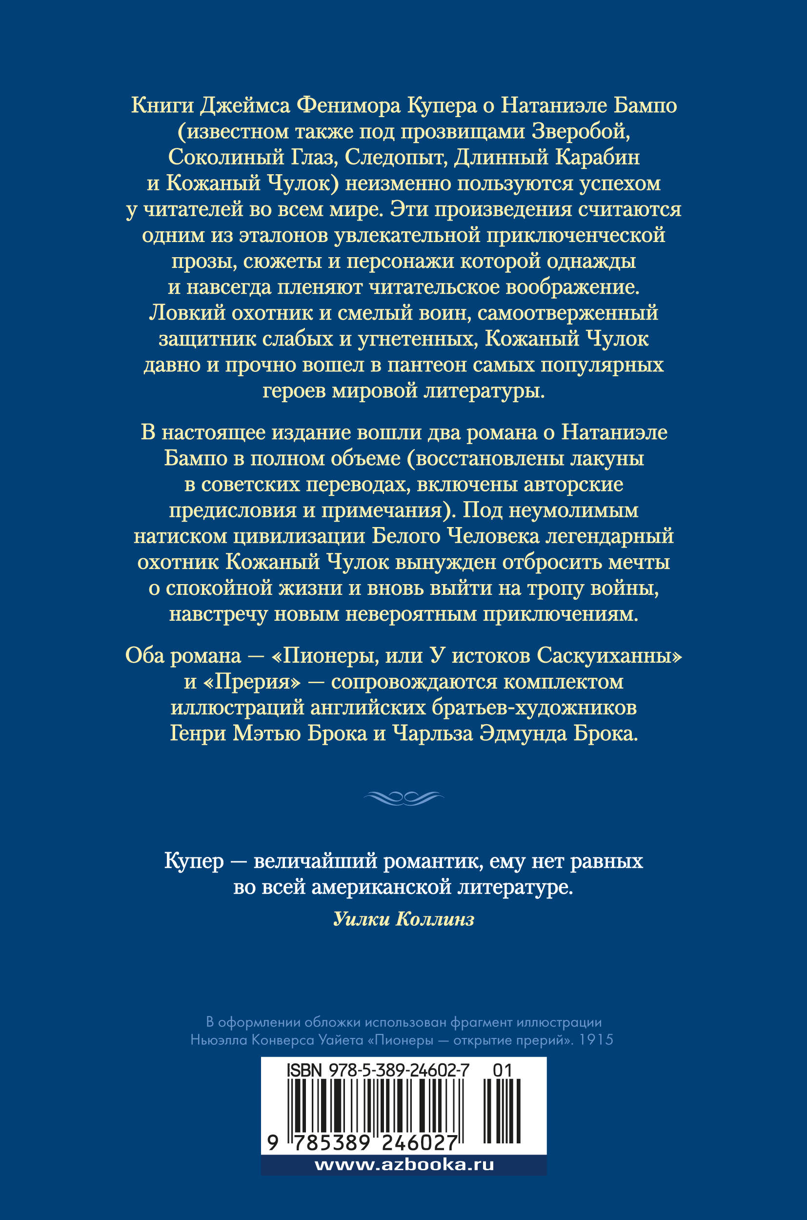 Книги Джеймса Фенимора Купера о Натаниэле Бампо (известном также под прозвищами Зверобой, Соколиный Глаз, Следопыт, Длинный Карабин и Кожаный Чулок) неизменно пользуются успехом у читателей во всем мире. Эти произведения считаются одним из эталонов увлекательной приключенческой прозы, сюжеты и персонажи которой однажды и навсегда пленяют читательское воображение. Ловкий охотник и смелый воин, самоотверженный защитник слабых и угнетенных, Кожаный Чулок давно и прочно вошел в пантеон самых популярных героев мировой литературы. В настоящее издание вошли два романа о Натаниэле Бампо в полном объеме (восстановлены лакуны в советских переводах, включены авторские предисловия и примечания). Под неумолимым натиском цивилизации Белого Человека легендарный охотник Кожаный Чулок вынужден отбросить мечты о спокойной жизни и вновь выйти на тропу войны, навстречу новым невероятным приключениям. Оба романа - "Пионеры, или У истоков Саскуиханны" и "Прерия" - сопровождаются комплектом иллюстраций английских братьев-художников Генри Мэтью Брока и Чарльза Эдмунда Брока.| Издательство | Азбука-Аттикус Издат.группа ООО |