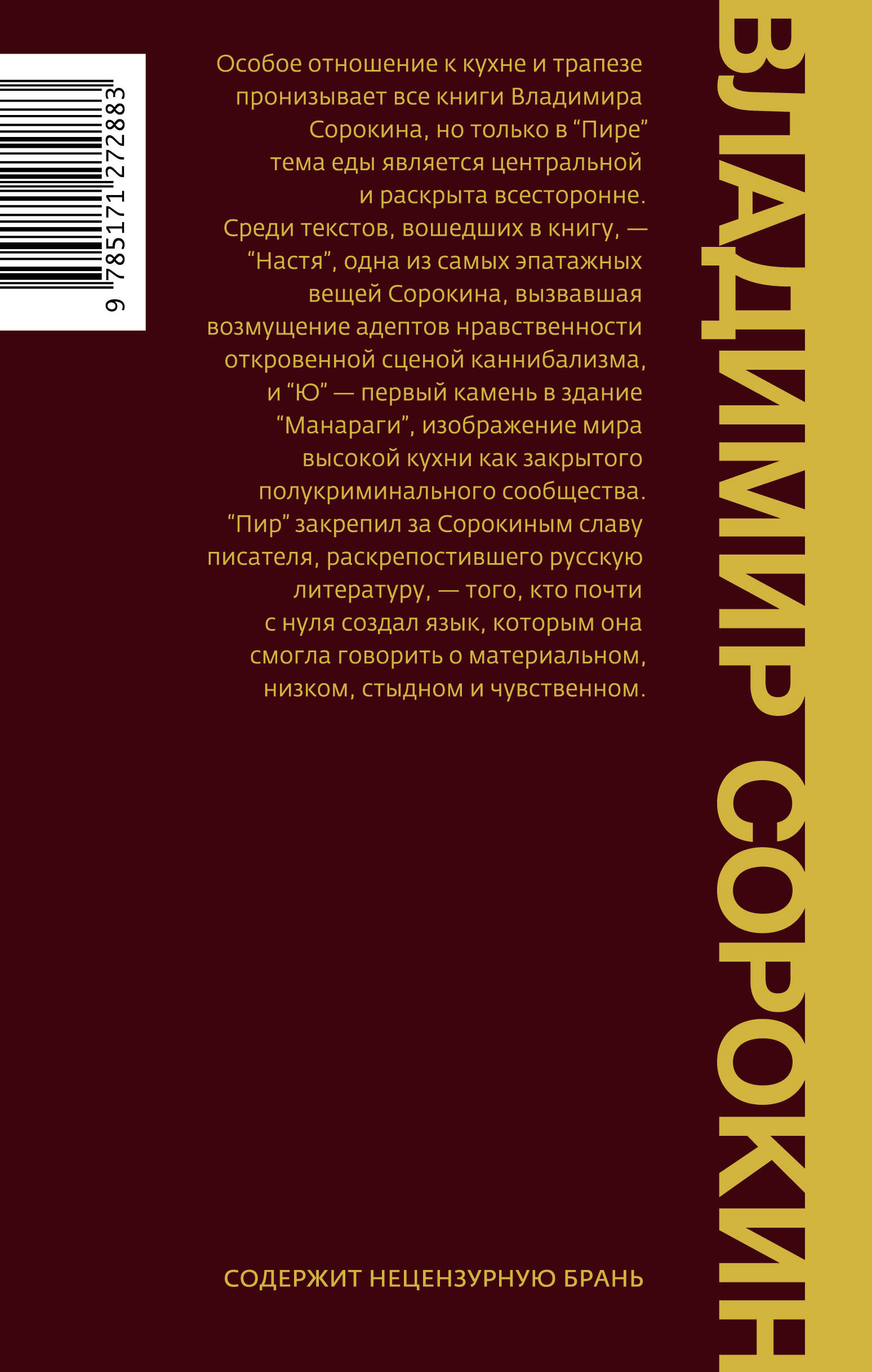 В серии «Весь Сорокин» выходит легендарный сборник рассказов «Пир», книга, сплетающая в одно яркое и невероятное полотно высокое и низменное, реальность и вымысел, классическую русскую литературу и советские клише. Главной темой этого сборника из тринадцати рассказов стала еда, еда во всех смыслах и во всех проявлениях. В эпоху постмодернизма и массового потребления едой становится и классическая культура, и язык советской пропаганды, и светлые чаяния русской интеллигенции начала XX века, и японские представления о красоте, и сам человек и даже пустота, которую, оказывается, можно поглощать ложками. Всё это может съедено и переварено. Некоторые из этих рассказов шокируют, некоторые заставляют серьезно задуматься, некоторые гомерически рассмеяться, некоторые поражают своей актуальностью и так резонируют с происходящим в России и в мире, словно они были написаны только вчера. Здесь каждый найдет для себя то, что он ищет в современной литературе: будь то символистский подтекст, философские размышления, социальную и политическую сатиру, прекрасный юмор или безупречный стиль. Равнодушным эта книга не оставит никого.| Издательство | ИЗДАТЕЛЬСТВО "АСТ" |