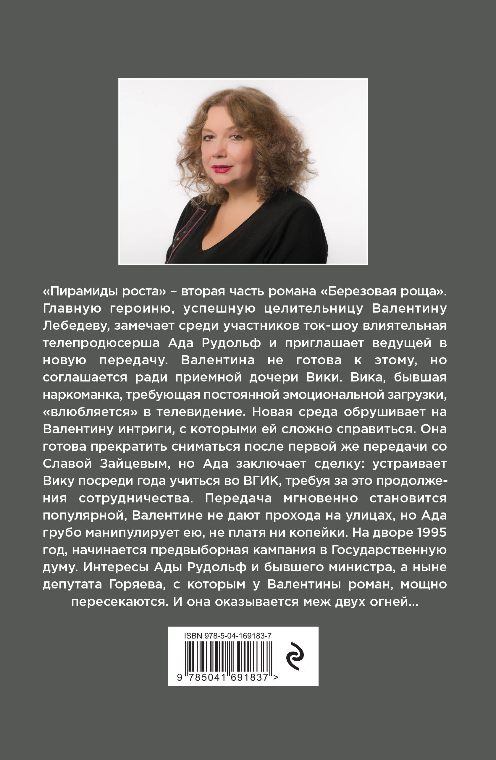 «Пирамиды роста» - вторая часть романа «Берёзовая роща». Главную героиню, успешную целительницу Валентину Лебедеву, замечает среди участников ток-шоу влиятельная телепродюсерша Ада Рудольф и приглашает ведущей в новую передачу. Валентина не готова к этому, но соглашается ради приёмной дочери Вики. Вика, бывшая наркоманка, требующая постоянной эмоциональной загрузки, «влюбляется» в телевидение. Новая среда обрушивает на Валентину интриги, с которыми ей сложно справиться. Она готова прекратить сниматься после первой же передачи со Славой Зайцевым, но Ада заключает сделку: устраивает Вику посреди года учиться во ВГИК, требуя за это продолжения сотрудничества. Передача мгновенно становится популярной, Валентине не дают прохода на улицах, но Ада грубо манипулирует ею, не платя ни копейки. На дворе 1995 год, начинается предвыборная кампания в Государственную думу. Интересы Ады Рудольф и бывшего министра, а ныне депутата Горяева, с которым у Валентины роман, мощно пересекаются. И она оказывается меж двух огней…