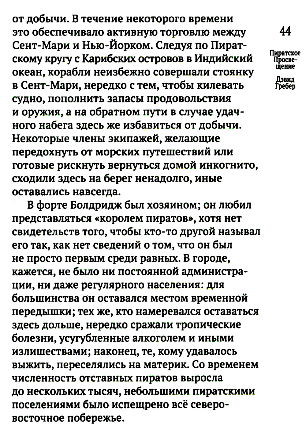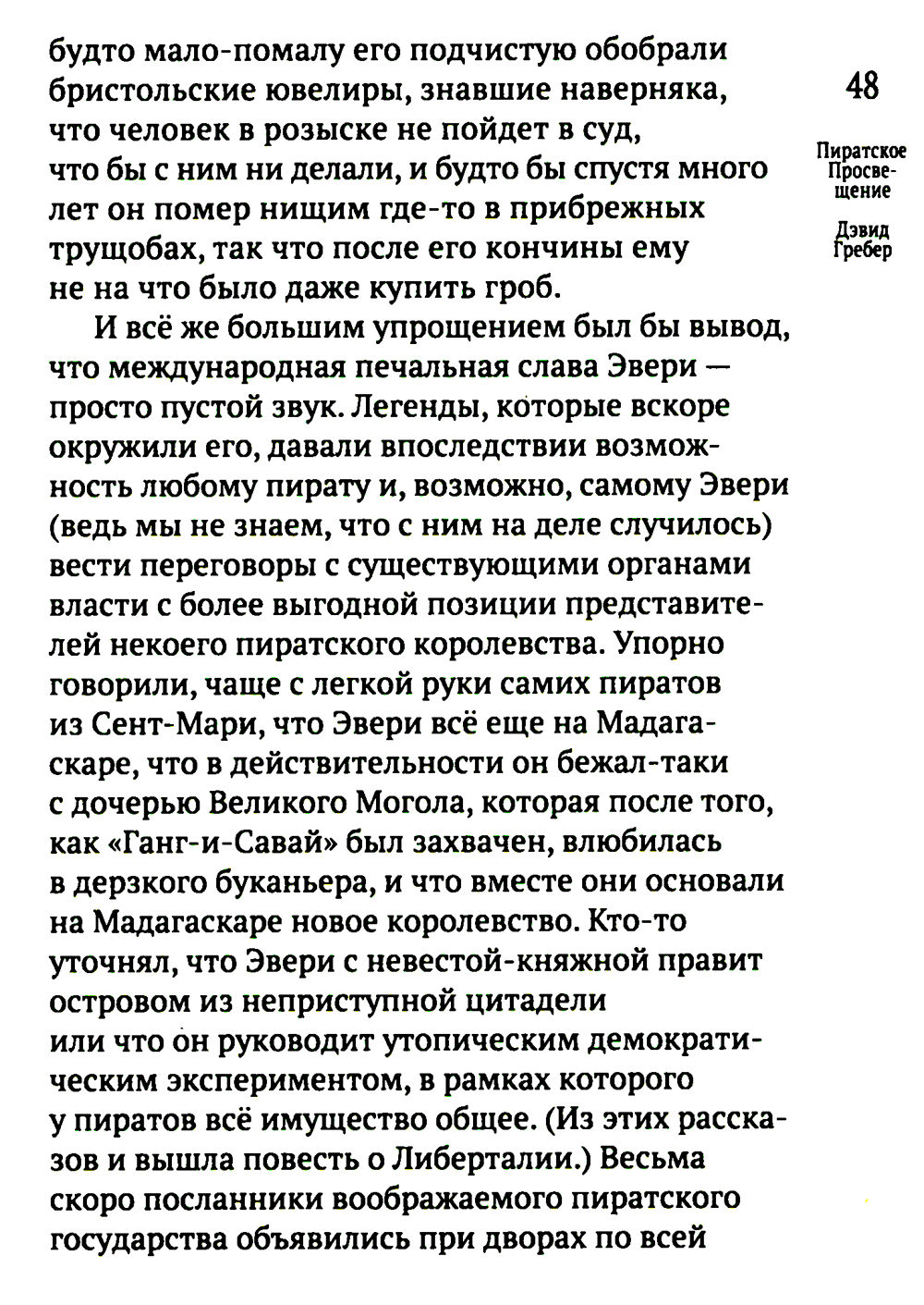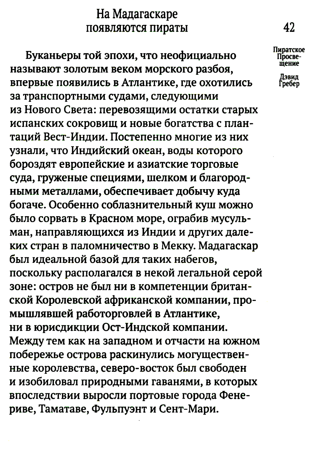 Последняя и изданная уже посмертно книга американского антрополога Дэвида Гребера (1961-2020) -результат его экспедиции на Мадагаскар, куда он отправился, будучи аспирантом Чикагского университета. В своей работе Гребер резко критикует европоцентричный взгляд, согласно которому «дикие народы» могут стать цивильными только в результате грамотного управления европейцев. Эта книга - смелая попытка вернуть антропологии и этнографии ее изначальную цель: поиск альтернативного взгляда на развитие общества и культуры. Гребер «деколонизирует Просвещение», доказывая, что истоки идей равенства, свободы и справедливости стоит искать за пределами «западной цивилизации». Он однозначно утверждает - те самые вымышленные эгалитарные «пиратские королевства» вроде Либерталии так или иначе существовали на самом деле. На примере Конфедерации бецимисарака Гребер описывает устройство реального проекта «общества будущего», о котором лишь фантазировал Томас Мор и другие авторы утопий.| Издательство | Ад Маргинем Пресс |