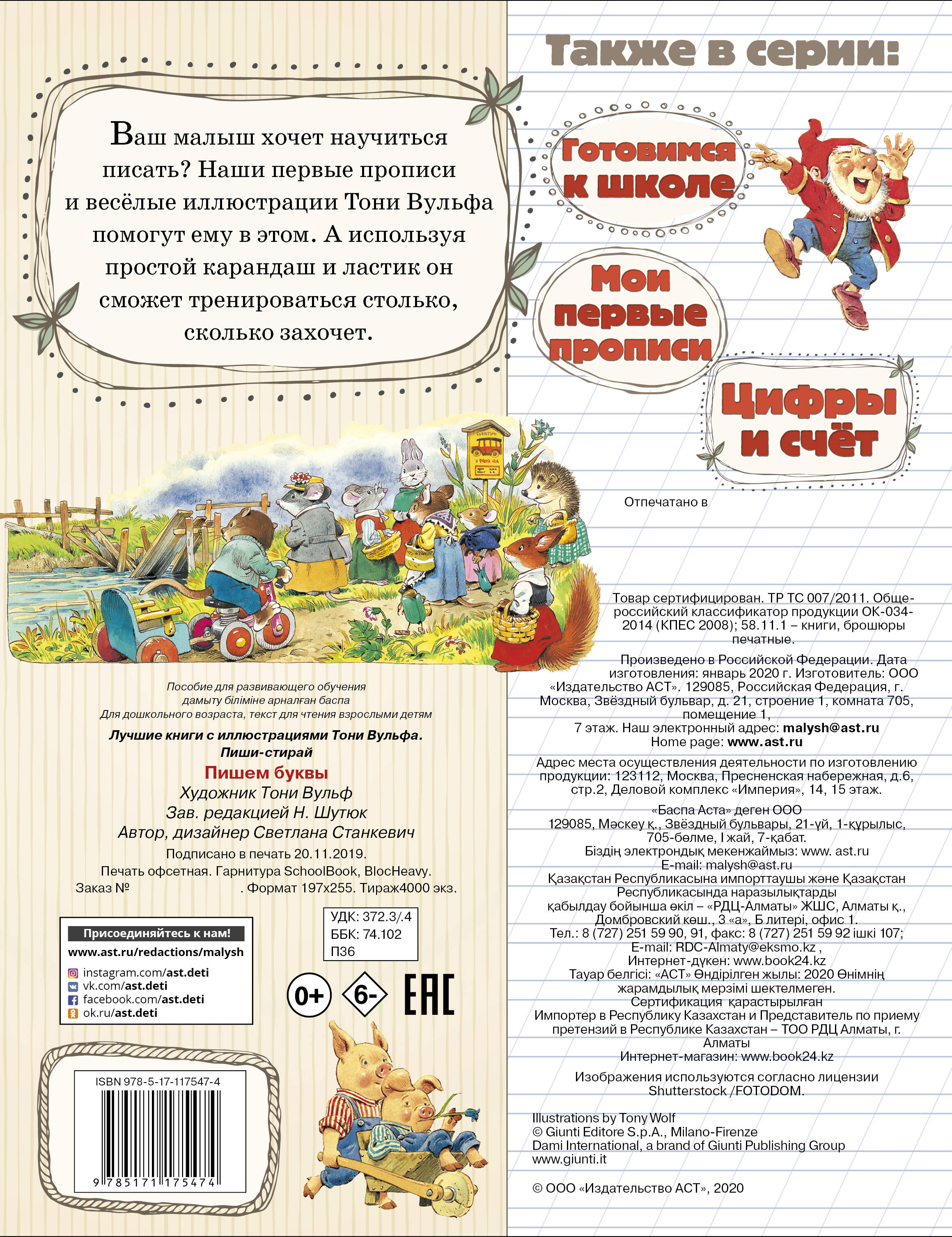 Серия "Пиши-стирай" это: - Идеальное решение для подготовки малыша к школе; - Обучение счёту, письму, развитие мелкой моторики; - Уроки выстроены от простого к сложному, что способствует лучшему усвоению материала; - Яркие и веселые иллюстрации Тони Вульфа;| Издательство | ИЗДАТЕЛЬСТВО "АСТ" |