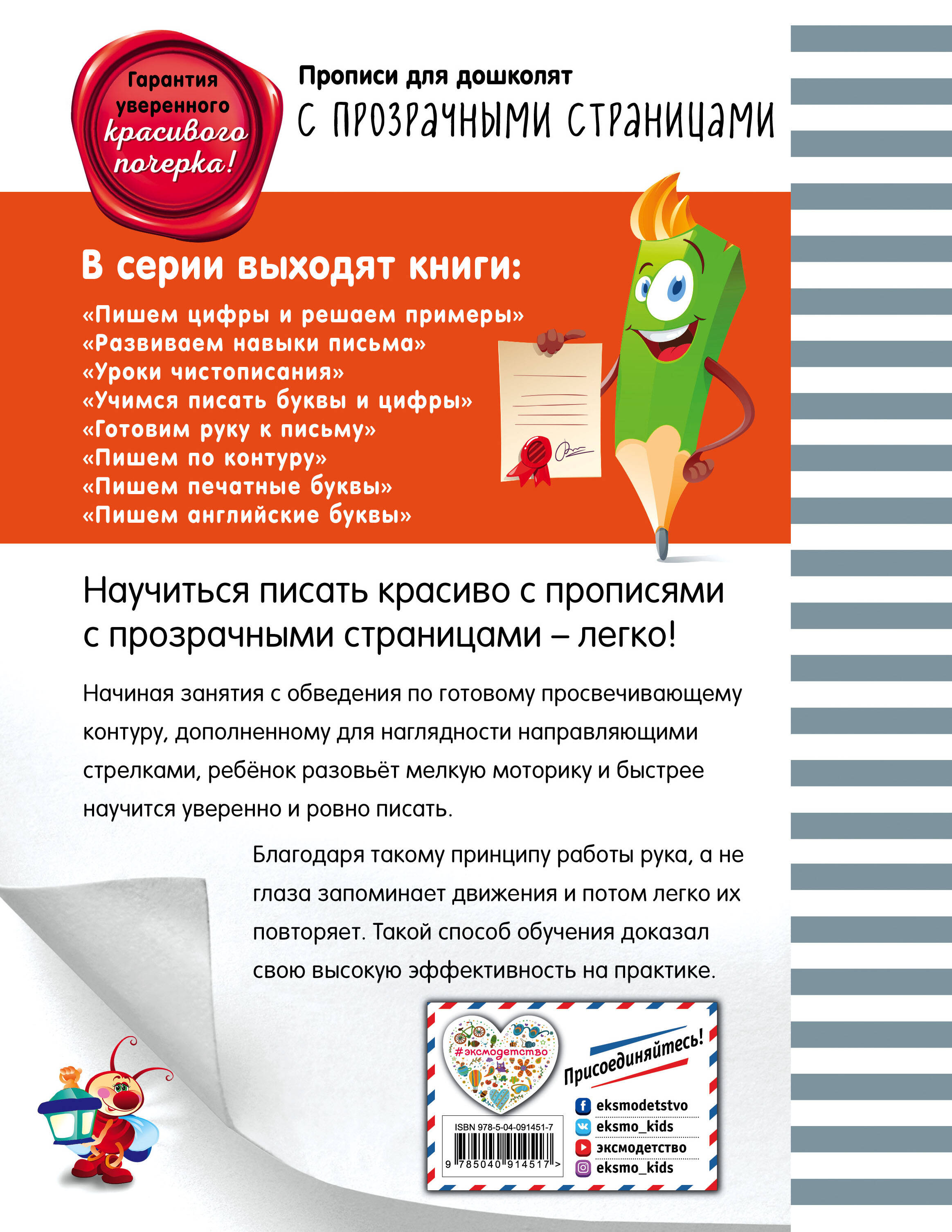 Это пособие поможет ребёнку научиться писать цифры правильно, красиво и аккуратно, а также освоить счёт и математические действия в пределах 10, развить познавательные способности, стать усидчивее. Принцип работы с прописью простой и интуитивно понятный: сначала ребёнок выполняет задания на счёт и решает примеры, затем обводит пример по контуру сквозь прозрачную страничку и продолжает писать самостоятельно. Писать нужно только на нечетных страницах. Такой необычный способ работы позволит сделать занятия интересными и эффективными, а весёлые развивающие задания позволят учащемуся легко перейти от привычной игровой деятельности к учебной. Рекомендовано для детей старшего дошкольного и младшего школьного возраста.