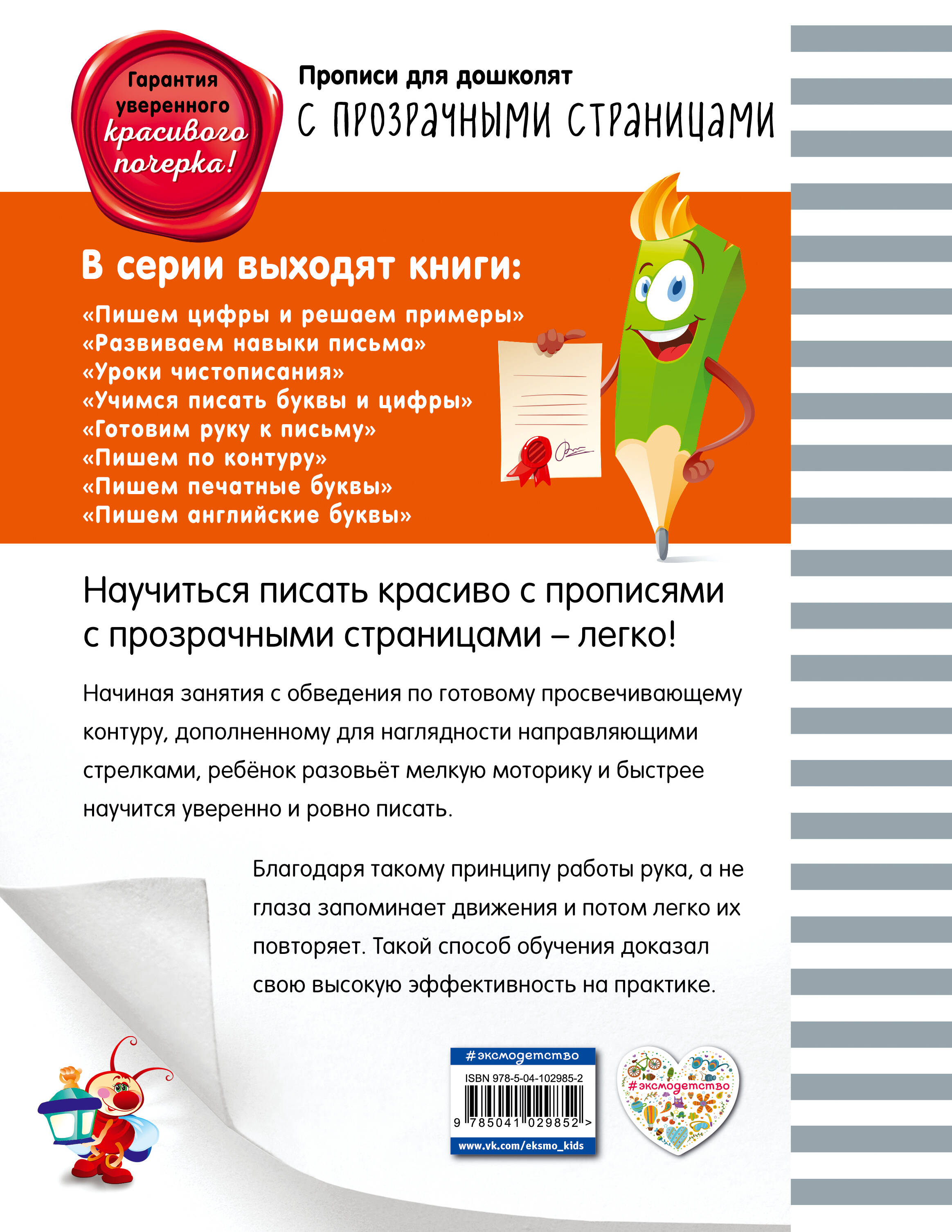 Удобные и необычные прописи с прозрачными страницами - это отличная возможность развить у ребёнка мелкую моторику и эффективно подготовить его к школе. Занимаясь по книге, ребёнок сможет укрепить мелкие мышцы кисти руки и научиться красиво писать цифры и решать несложные примеры. Начиная занятия с обведения по готовому просвечивающемуся контуру, дополненному для наглядности направляющими стрелками, ребёнок быстрее научится уверенно и ровно писать цифры. Благодаря такому принципу работы рука, а не глаза, запоминает движения и потом легко их повторяет. Кроме того, в данной прописи представлены увлекательные задания, которые помогут ребёнку в игровой форме развить логику, освоить математические действия и счёт в пределах 10.| Издательство | ООО "Издательство "Эксмо" |