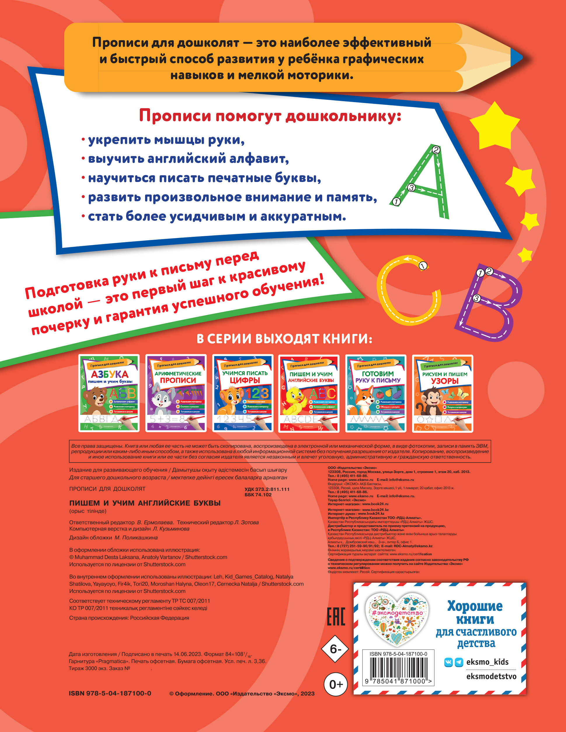 Задача прописей для дошкольников - не только научить ребенка писать буквы, но и помочь ему выучить английский алфавит, познакомить с первыми иностранными словами и их произношением. Выполняя увлекательные игровые задания, ребенок будет обводить буквы по пунктиру, вписывать их в слова, составлять из букв новые слова. Написание букв способствует не только их быстрому запоминанию, но и вырабатывает у дошкольника навык чистописания и орфографическую зоркость, которые являются важнейшим условием грамотного письма. Забавные позитивные картинки доставят детям удовольствие и будут способствовать получению высокого результата. Кроме того, пропись поможет развить у ребенка мелкую моторику, графические навыки, усидчивость, внимание и терпение - навыки, которые очень важны для обучения в школе.| Издательство | ООО "Издательство "Эксмо" |
