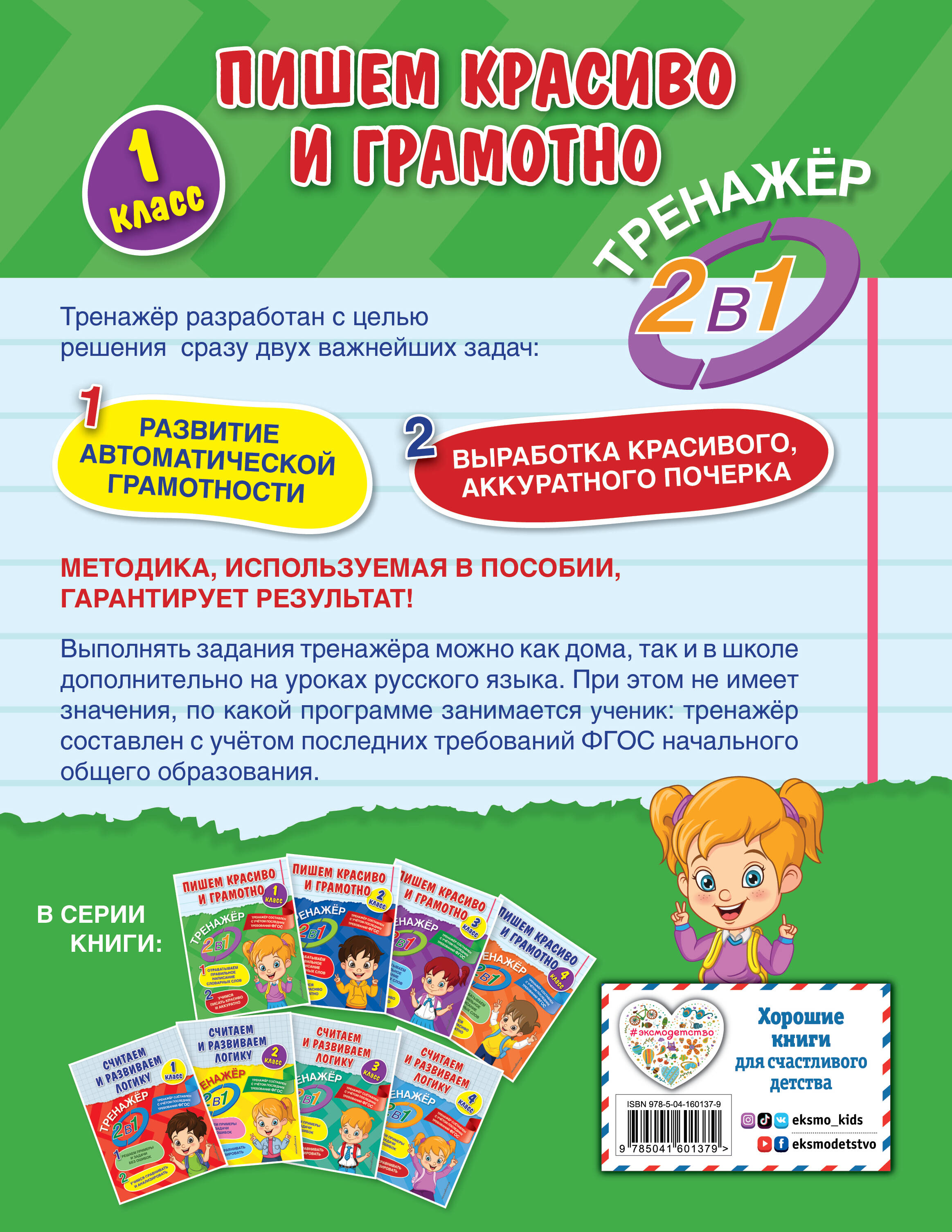 Тренажёр преследует две цели: научить первоклассника писать и грамотно, и красиво. Для этого разработаны задания на повторение и запоминание словарных слов. Каждое из них, написанное каллиграфической прописью, нужно обвести. При использовании этой методики у ученика одновременно будет формироваться красивый разборчивый почерк и автоматическая грамотность. Уникальность этого тренажёра, созданного с учётом требований ФГОС начального общего образования, заключается в комбинировании заданий и оригинальной подаче материала. Выполняя задания, ребёнок будет: • разгадывать ребусы; • решать анаграммы и несложные кроссворды; • находить и исправлять специально допущенные ошибки в текстах; • развивать культуру речи; • повышать общую эрудицию.| Издательство | Эксмо |