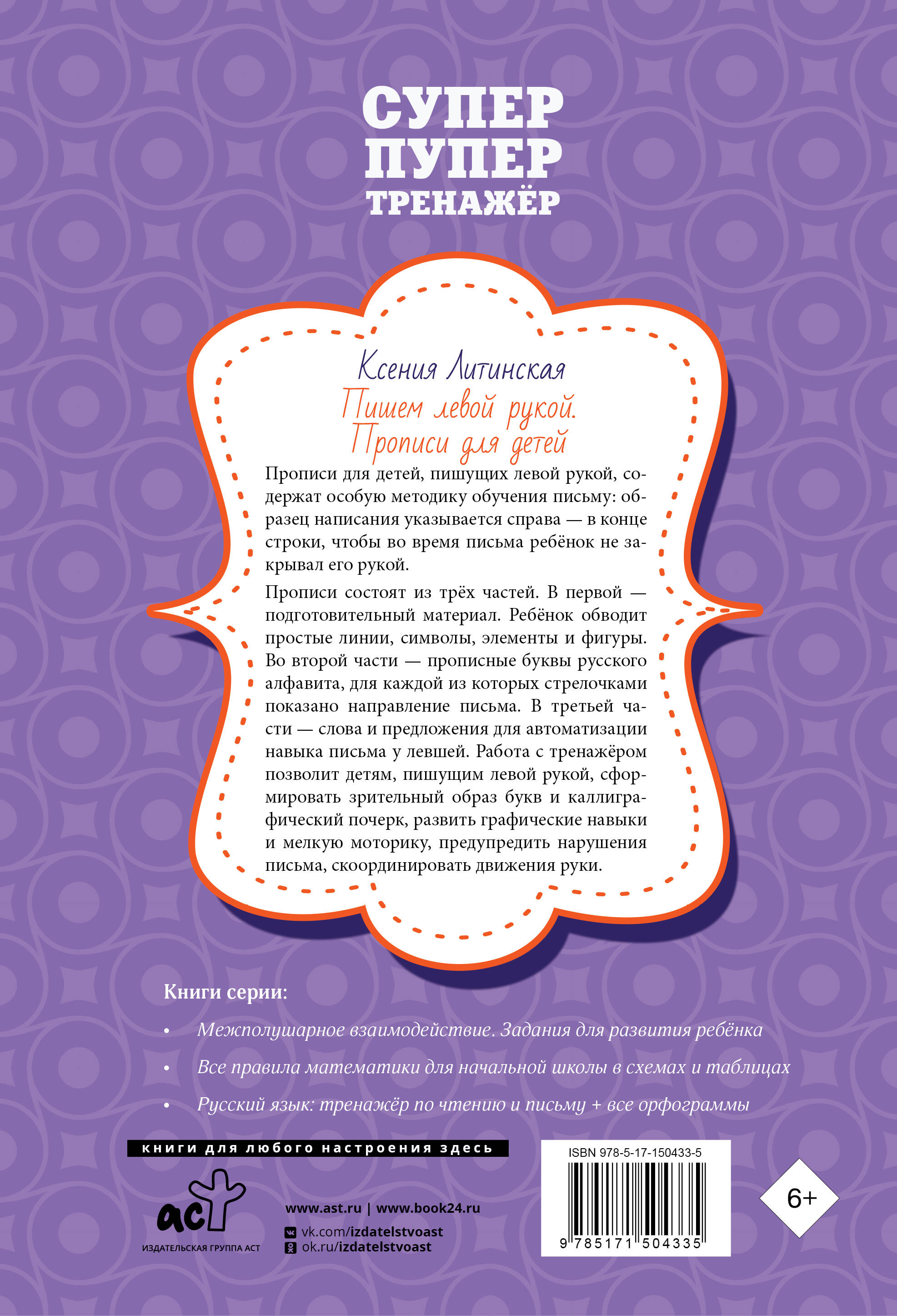 Прописи для детей, пишущих левой рукой, содержат особую методику обучения письму: образец написания указывается справа - в конце строки, чтобы во время письма ребёнок не закрывал его рукой. Прописи состоят из трёх частей. В первой - подготовительный материал. Ребёнок обводит простые линии, символы, элементы и фигуры. Во второй части - прописные буквы русского алфавита, для каждой из которых стрелочками показано направление письма. В третьей части - слова и предложения для автоматизации навыка письма у левшей. Работа с тренажёром позволит детям, пишущим левой рукой, сформировать зрительный образ букв и каллиграфический почерк, развить графические навыки и мелкую моторику, предупредить нарушения письма, скоординировать движения руки. Пособие удобного формата предназначено для учащихся начальной школы, но также может быть полезно при подготовке детей к школе.| Издательство | АСТ |