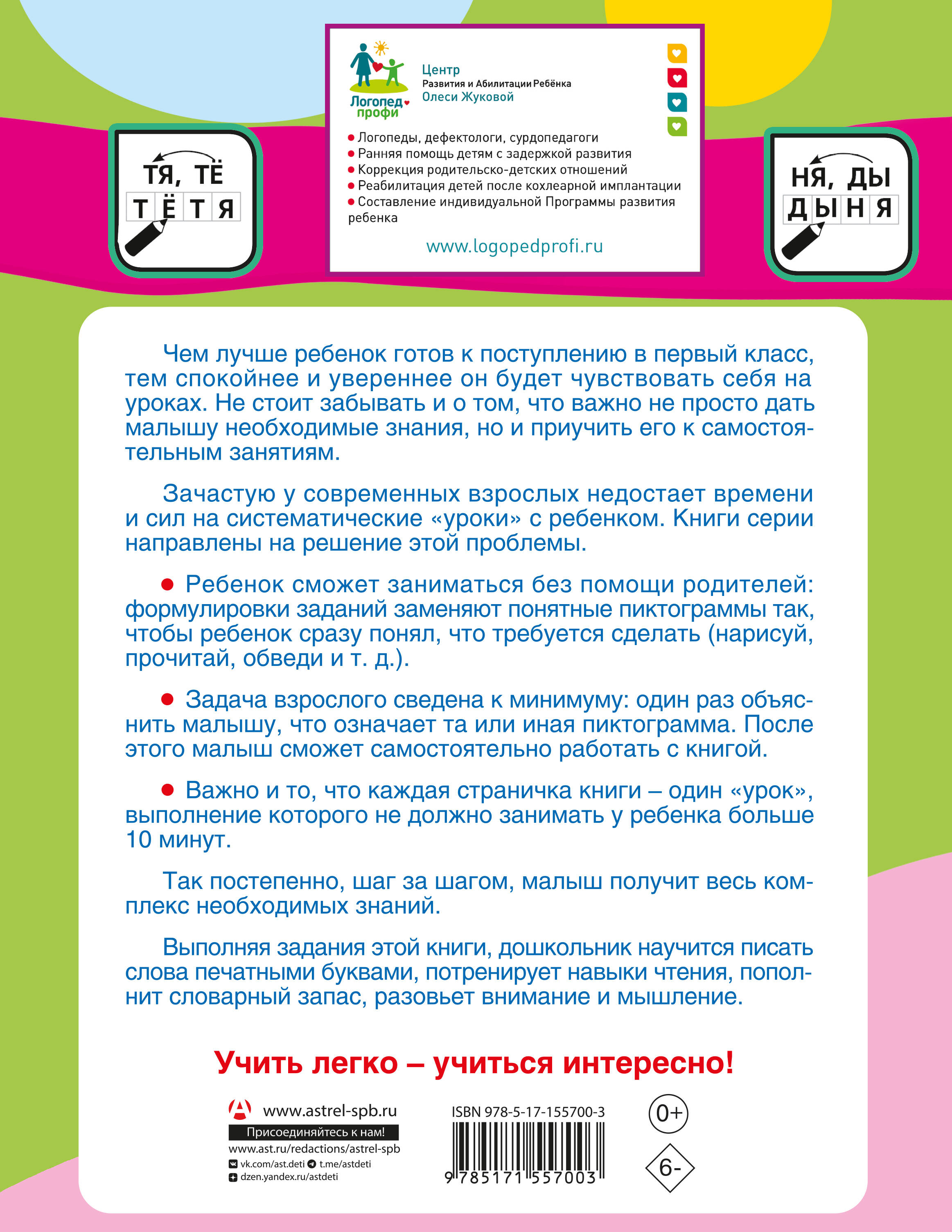 Книги этой серии созданы специально для занятых родителей. Дети вполне смогут заниматься без помощи взрослых: формулировки заданий заменяют понятные пиктограммы так, чтобы ребенок сразу понял, что требуется сделать (нарисуй, прочитай, обведи и т. д.). Такие занятия приучают малыша к самостоятельному выполнению заданий, что является важнейшим навыком для будущего первоклассника. Выполняя задания этой книги, дошкольник научится писать слова печатными буквами, потренирует навыки чтения и пополнит словарный запас. Для дошкольного возраста.| Издательство | ИЗДАТЕЛЬСТВО "АСТ" |
