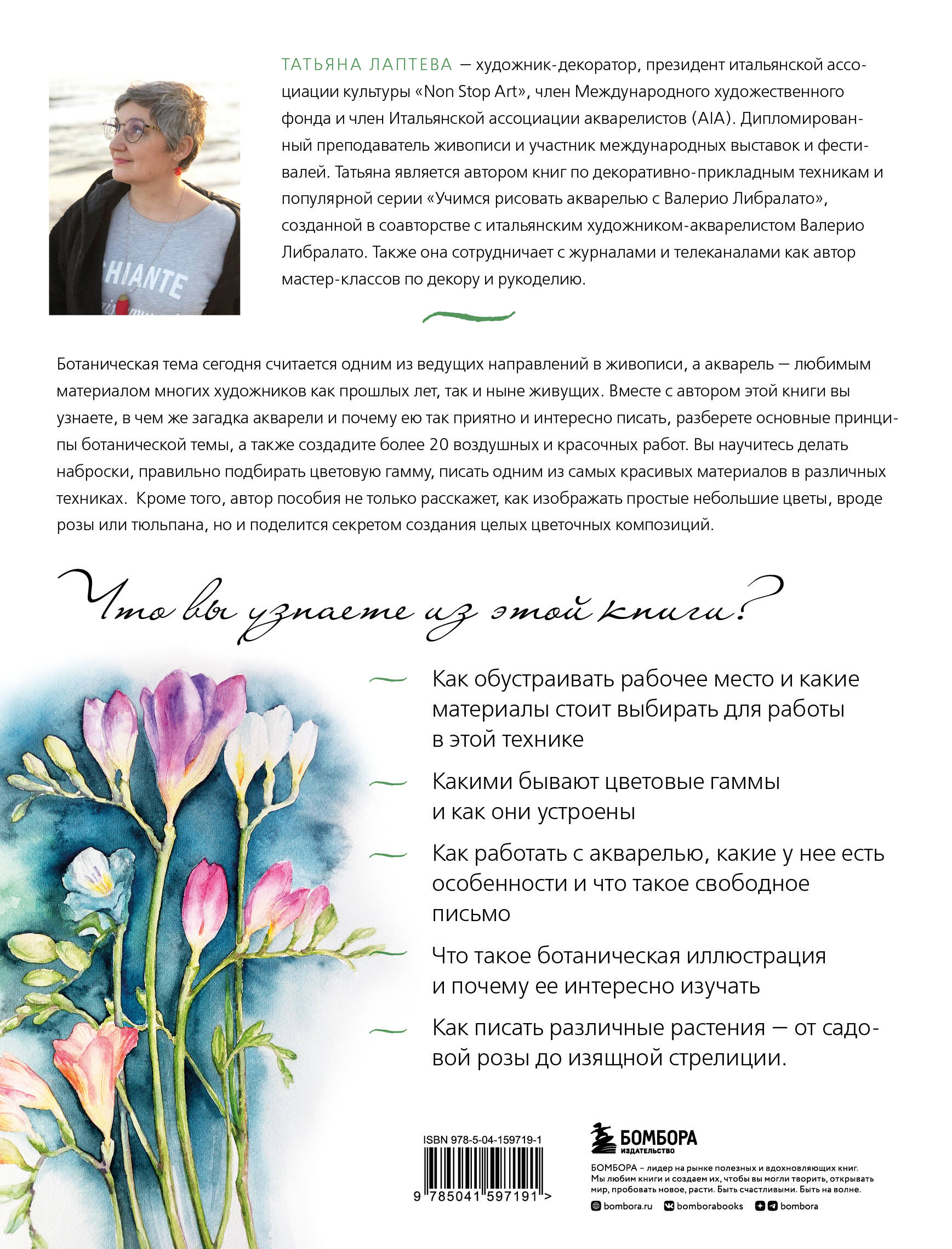 Откройте для себя удивительный мир акварельной ботанической живописи вместе с Татьяной Лаптевой - дипломированным преподавателем и автором книг популярной серии «Учимся рисовать акварелью с Валерио Либралато». На страницах нового пособия вас ждет разбор материалов и художественных принадлежностей, основные правила работы с акварелью, особенности ботанической живописи, а также подробные пошаговые уроки по рисованию растительных сюжетов. Вместе с автором вы научитесь рисовать более 20 ярких цветов и целых композиций, а также освоите самую популярную художественную технику. А уникальный авторский метод обучения пользуется успехом не только в России, но и в Италии, где многие начинающие художники освоили метод акварельной живописи.| Издательство | ООО "Издательство "Эксмо" |