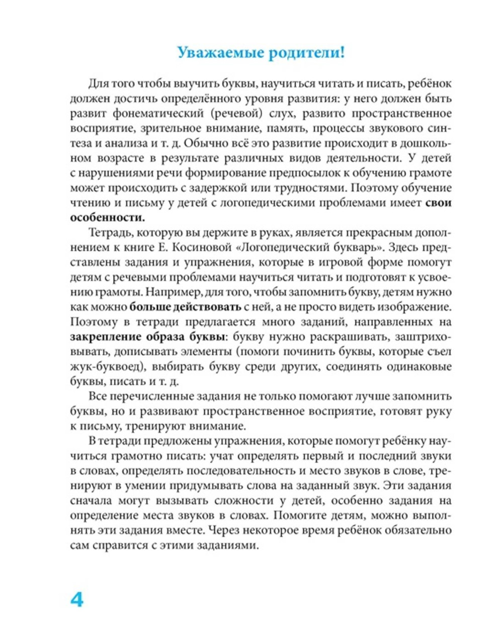 Первые уроки русского языка малыш получает ещё задолго до школы. И от того, насколько они интересные, во многом зависят успехи малыша. Что поможет ему в дальнейшем избежать ошибок в речи и на письме? Эта книга представляет собой уникальную систему занятий, разработанную логопедом-практиком Еленой Косиновой, автором популярных книг и пособий. Здесь представлены задания и упражнения, которые в игровой форме помогают малышам научиться осмысленно читать и грамотно писать. Специальные упражнения способствуют формированию языкового чутья, познавательной и творческой активности малышей, развитию памяти и внимания. Выполнение заданий доставит немало приятных минут маленькому читателю и вызовет интерес к учёбе.| Издательство | Махаон |