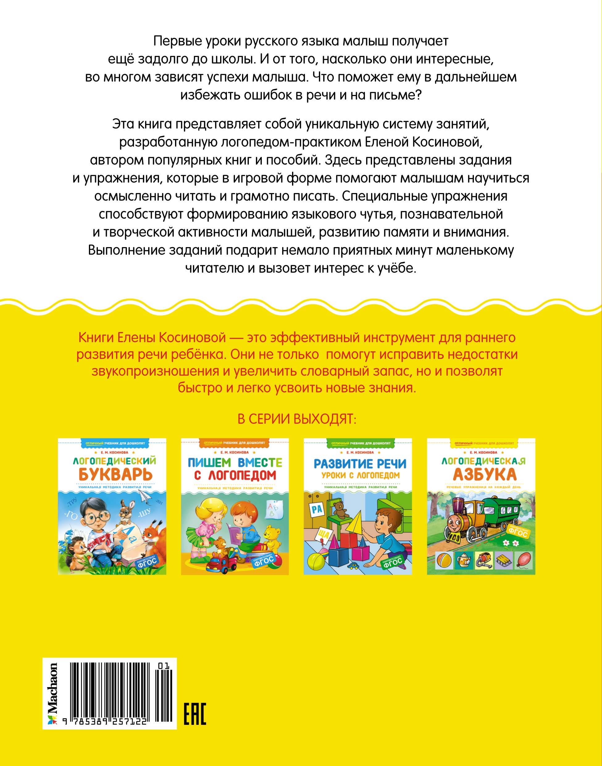 Первые уроки русского языка малыш получает ещё задолго до школы. И от того, насколько они интересные, во многом зависят успехи малыша. Что поможет ему в дальнейшем избежать ошибок в речи и на письме? Эта книга представляет собой уникальную систему занятий, разработанную логопедом-практиком Еленой Косиновой, автором популярных книг и пособий. Здесь представлены задания и упражнения, которые в игровой форме помогают малышам научиться осмысленно читать и грамотно писать. Специальные упражнения способствуют формированию языкового чутья, познавательной и творческой активности малышей, развитию памяти и внимания. Выполнение заданий доставит немало приятных минут маленькому читателю и вызовет интерес к учёбе.| Издательство | Азбука-Аттикус Издат.группа ООО |
