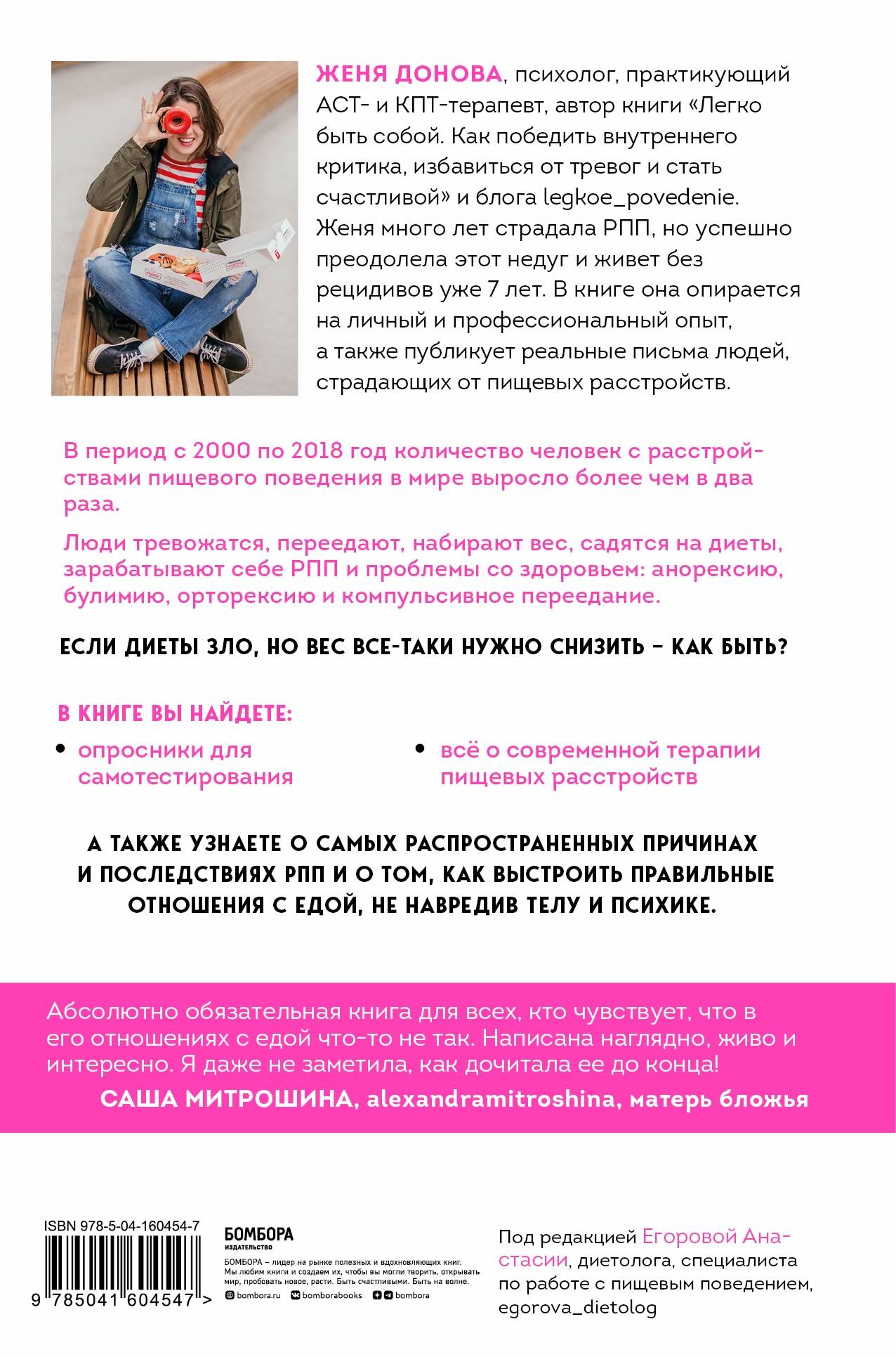 В век пищевого изобилия, когда нам доступны любые продукты, а найти информацию о правильном питании не составляет труда, люди все равно продолжают страдать от различных пищевых расстройств. Из новой книги практикующего психолога Жени Доновой вы узнаете, откуда берется недовольство собственным телом, какие самые распространенные причины и последствия РПП, что считается нормой, а что тревожным звоночком, какая терапия пищевых расстройств применима сегодня. Вы поймете, как выстроить правильные отношения с едой, не навредив телу и психике.| Издательство | ООО "Издательство "Эксмо" |