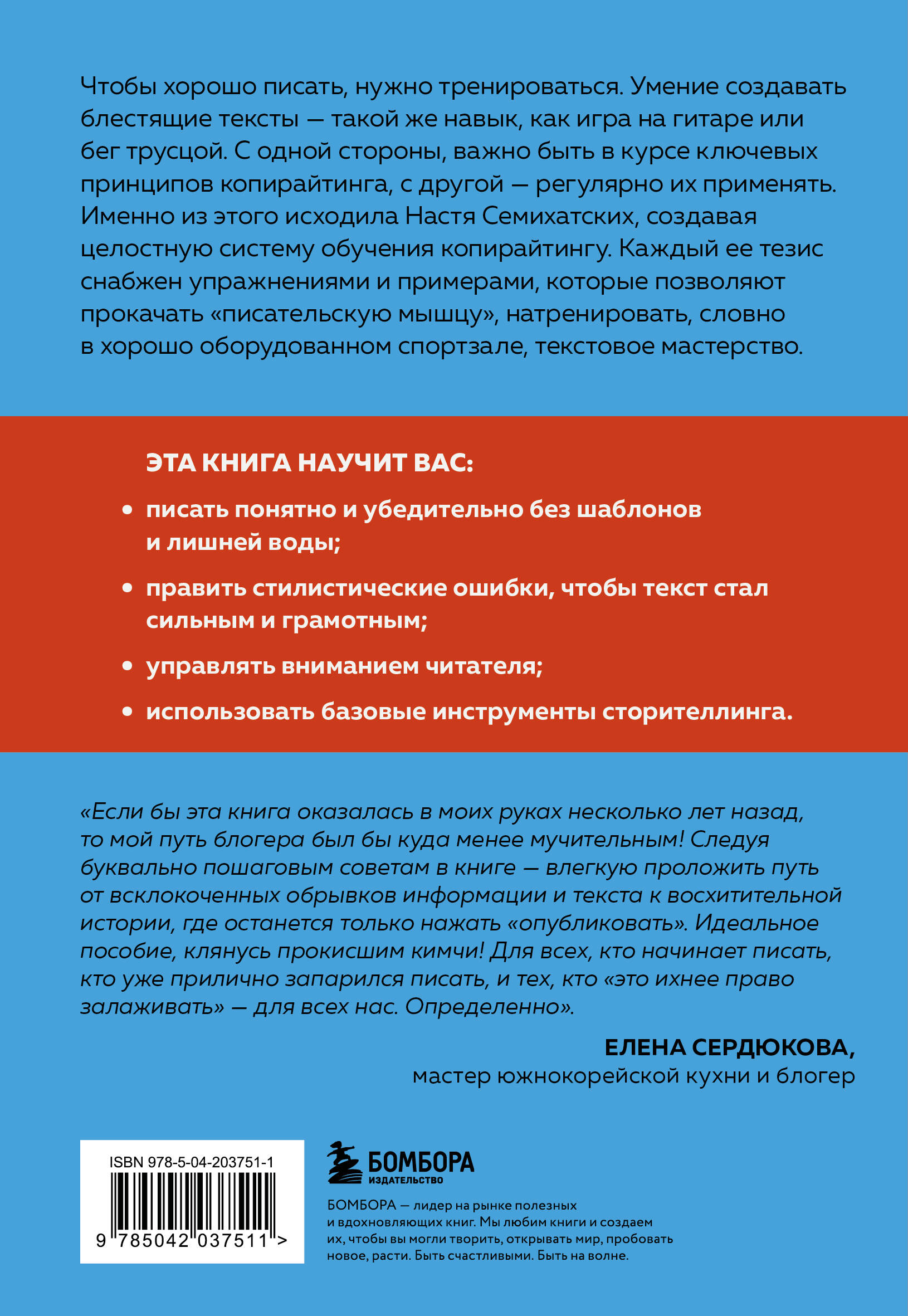Чтобы хорошо писать, нужно тренироваться. Умение создавать блестящие тексты - такой же навык, как игра на гитаре или бег трусцой. С одной стороны, важно быть в курсе ключевых принципов копирайтинга, с другой - регулярно их применять. Именно из этого исходила Настя Семихатских, создавая целостную систему обучения копирайтингу. Каждый ее тезис снабжен упражнениями, которые позволяют прокачать «писательскую мышцу», натренировать, словно в хорошо оборудованном спортзале, текстовое мастерство. Этак книга научит вас: - писать понятно и убедительно, без шаблонов и лишней воды; - править стилистические ошибки, чтобы текст стал сильным и грамотным; - управлять вниманием читателя; - использовать базовые инструменты сторителлинга. ОТЗЫВ: «Если бы эта книга оказалась в моих руках несколько лет назад, то мой путь блогера был бы куда менее мучительным! Следуя буквально пошаговым советам в книге - влегкую проложить путь от всклокоченных обрывков информации и клоков текста к восхитительной истории, где останется только нажать "опубликовать". Идеальное пособие, клянусь прокисшим кимчи! Для всех, кто начинает писать, кто уже прилично запарился писать и тех, кто "это ихнее право залаживать" - для всех нас. Определенно». - Елена Сердюкова, мастер южнокорейской кухни и блогер| Издательство | ООО "Издательство "Эксмо" |