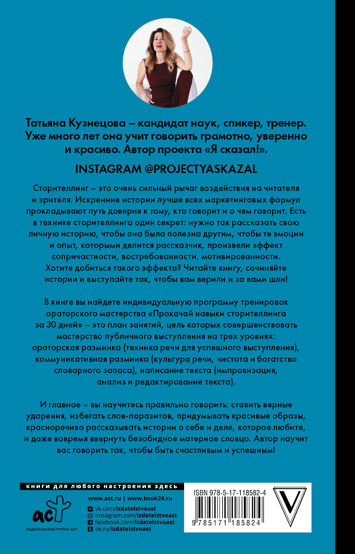 Крутой автор. Татьяна Кузнецова - кандидат наук, спикер, тренер. Уже много лет она, преподаватель с большим стажем, учит говорить грамотно, уверенно и красиво. Свыше 25 лет педагогического опыта. Работа в школе, авторские программы по литературе, внедрение курса школьной риторики, написание учебников и методических пособий по русскому языку и риторике для средней школы. За годы преподавания в вузе создано несколько десятков рабочих программ по культуре речи, письменной юридической речи, языку деловой документации, организованы и пользуются популярностью курсы Культуры речи и ораторского мастерства в деятельности работников судебной системы. С 2010 года преподаю культуру речи в рамках повышения квалификации работников аппарата федеральных и арбитражных судов РФ. Автор и ведущий ораторских курсов в «Школе молодого преподавателя». Инициатор движения «Говорить правильно модно!», которое реализуется в молодежной среде совместно с практикующими ораторами, ведущими, политиками, актерами. Вдохновитель, создатель и главный тренер «Школы ведущих», принимающей ежегодно уже на протяжение 5 лет до 100 участников в год. Также среди моих слушателей - преподаватели и методисты Высшей школы экономики, судьи и помощники судей. Автор проекта "Я сказал!", обучающего культуре речи и сторителлингу. Instagram @projectyaskazal| Издательство | ИЗДАТЕЛЬСТВО "АСТ" |