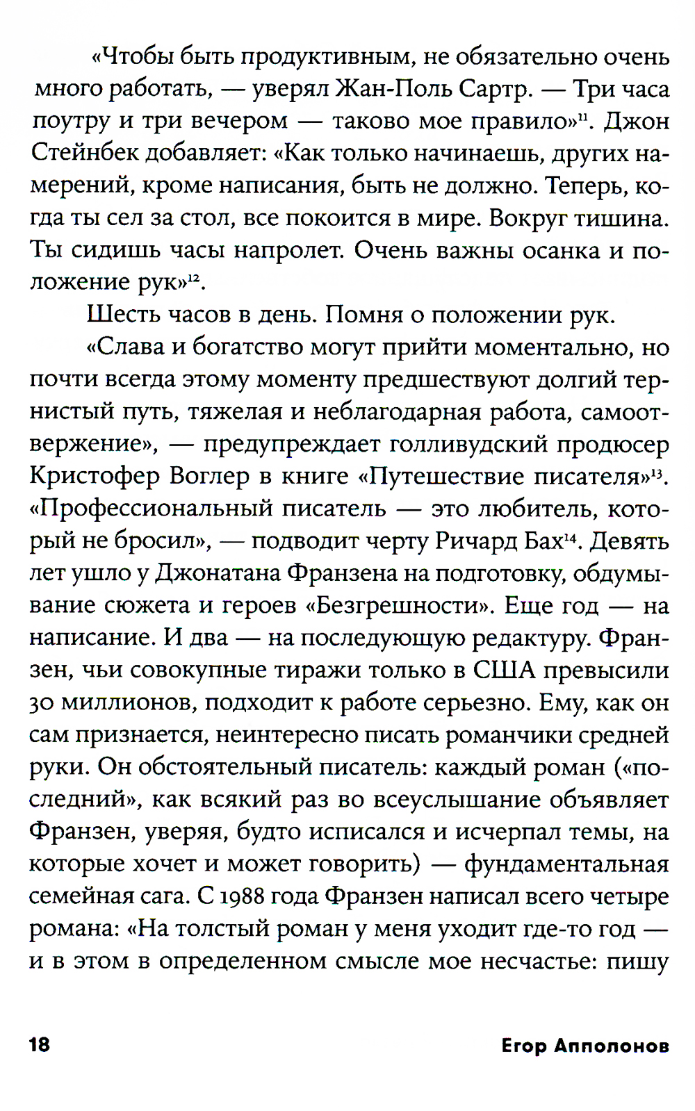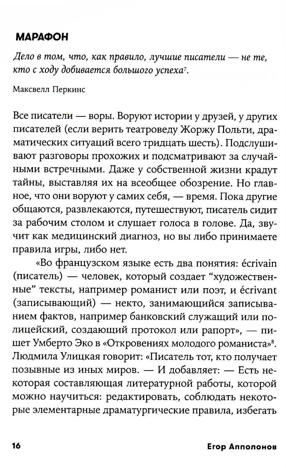 Журналист и создатель Telegram-канала «Хемингуэй позвонит» Егор Апполонов в своей книге разбирается в анатомии творчества, обращаясь к опыту выдающихся классиков и писателей современности - Умберто Эко, Алексея Иванова, Джона Стейнбека, Нила Геймана, Алексея Сальникова, Майи Кучерской, Кормака Маккарти, Маргарет Этвуд, Виктора Пелевина, Джеймса Паттерсона, Евгения Водолазкина и многих других. В первой части книги вам предстоит пройти «путь писателя»: от создания романа до его издания. С чего начать работу, как преодолеть писательский блок, где брать идеи, темы, убедительных персонажей и как найти свой стиль. Вы узнаете о подводных камнях самиздата и особенностях работы с издательством. Вторая часть книги - диалоги о ремесле с известными писателями, в которых они делятся своими страхами и сомнениями, советами и секретами мастерства. И помните, что ни одна книга не научит вас быть писателем, но, прочитав эту книгу и проанализировав опыт великих писателей, вы, возможно, поймете, как им стать.| Издательство | Альпина Паблишер |