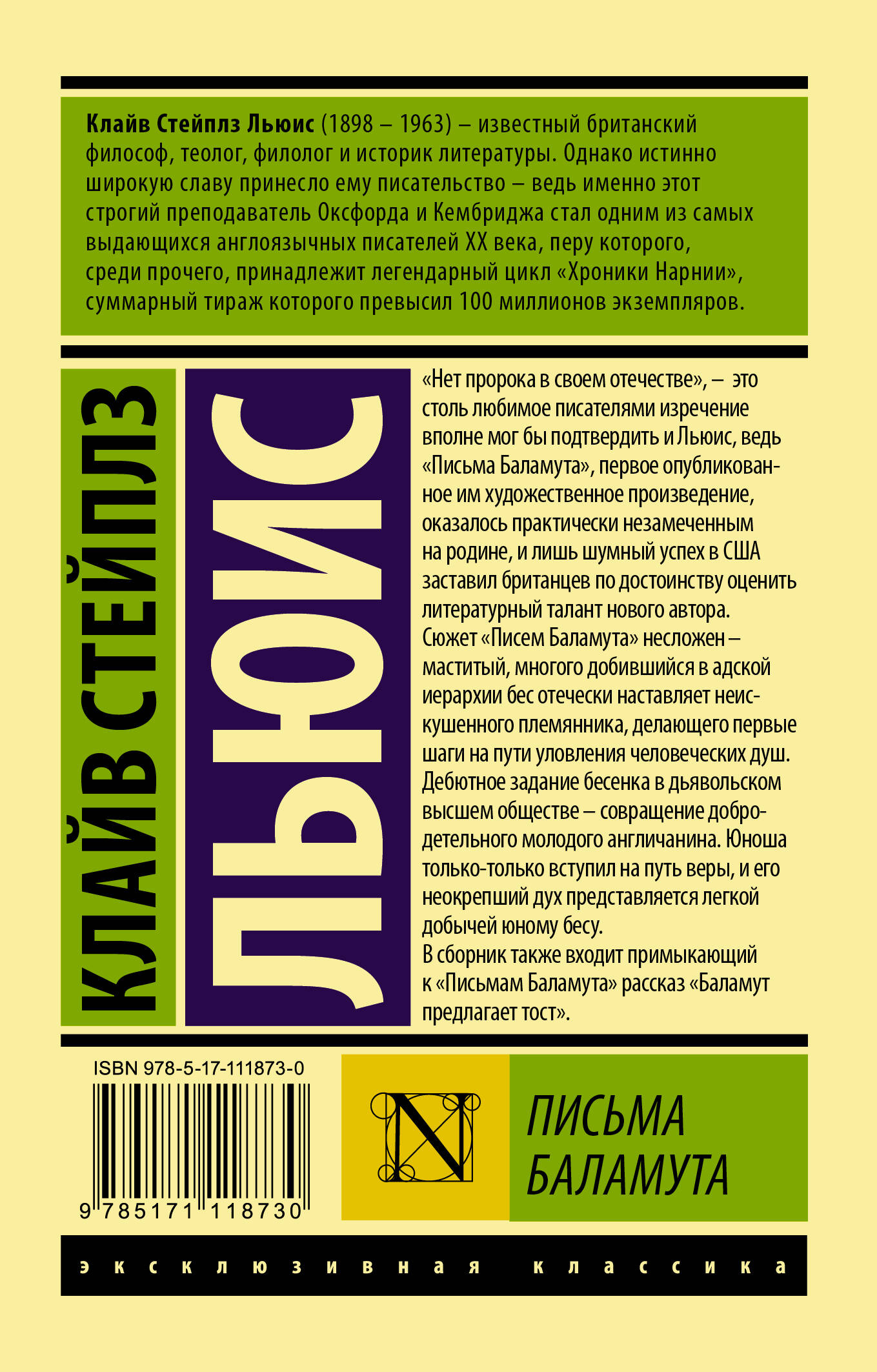 "Нет пророка в своем отечестве", - это столь любимое писателями изречение вполне мог бы подтвердить и Льюис, ведь "Письма Баламута", первое опубликованное им художественное произведение, оказалось практически незамеченным на родине, и лишь шумный успех в США заставил британцев по достоинству оценить литературный талант нового автора. Сюжет "Писем Баламута" несложен - маститый, многого добившийся в адской иерархии бес отечески наставляет неискушенного племянника, делающего первые шаги на пути уловления человеческих душ. Дебютное задание бесенка в дьявольском высшем обществе - совращение добродетельного молодого англичанина. Юноша только-только вступил на путь веры, и его неокрепший дух представляется легкой добычей юному бесу. В сборник также входит примыкающий к "Письмам Баламута" рассказ "Баламут предлагает тост".| Издательство | ИЗДАТЕЛЬСТВО "АСТ" |