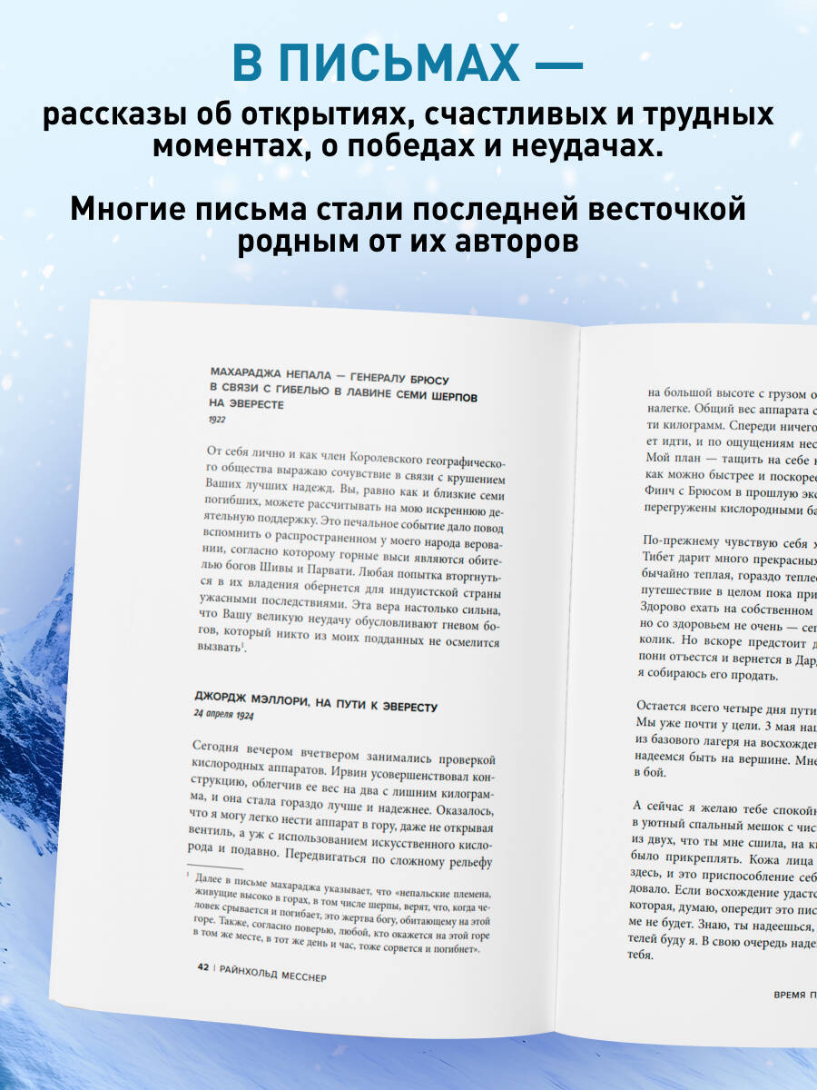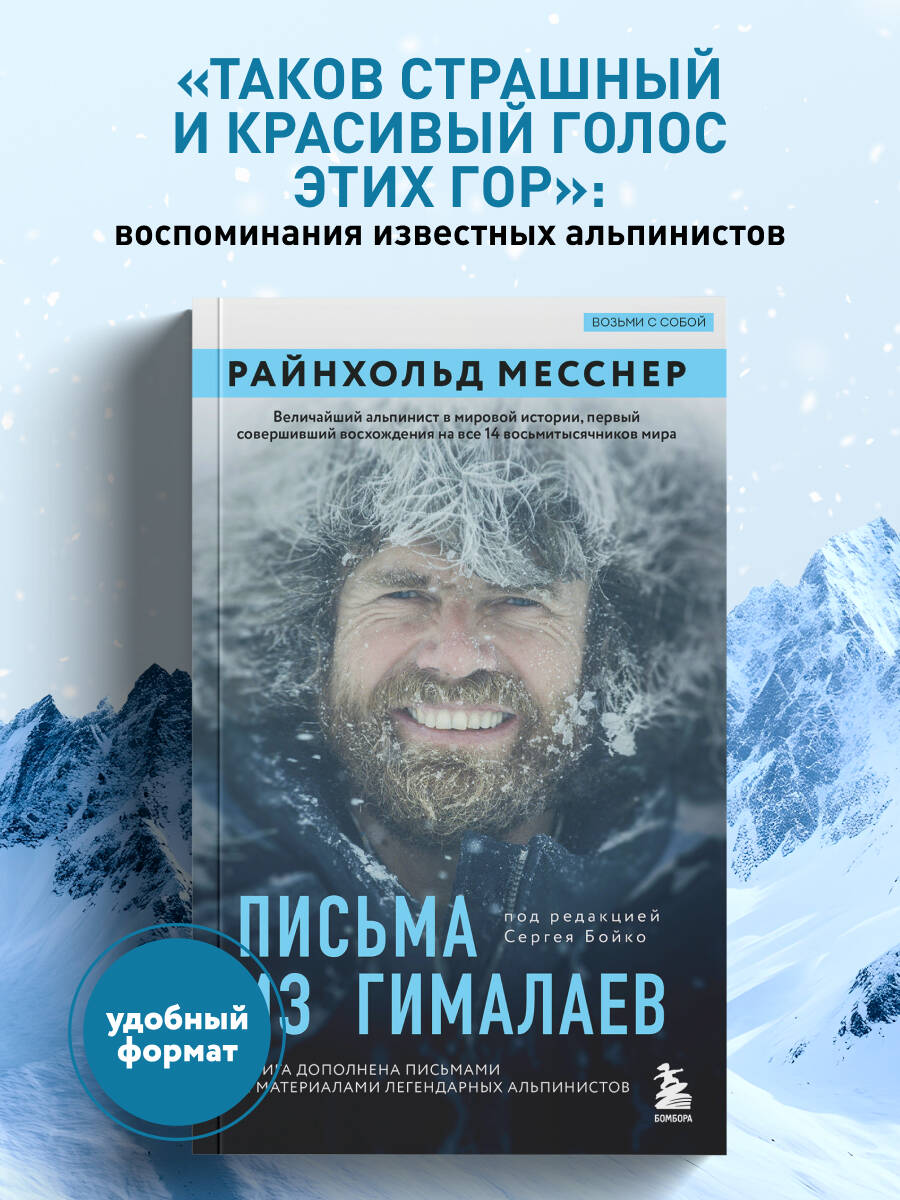 Райнхольд Месснер - живая легенда альпинизма, путешественник, писатель и человек, навсегда изменивший представление о возможностях человека в горах. Осенью 1986 года он совершил то, что считалось невозможным: первым в истории поднялся на все 14 восьмитысячников мира без искусственного кислорода, а два из них прошел в одиночку. За его плечами - более 3000 восхождений, 100 первовосхождений и 70 книг, переведенных на десятки языков. В этой книге Райнхольд Месснер подводит итог более чем столетней истории высотного альпинизма, опираясь на редкие архивные материалы, документы и личные свидетельства. Особую ценность изданию придают уникальные, ранее не публиковавшиеся письма из Гималаев - голоса тех, кто стоял у истоков альпинизма: Альберта Маммери, Вильгельма Вельценбаха, Джорджа Мэллори и других легенд. Это письма о страхе и надежде, о победах и поражениях, о выборе между возвращением и шагом в неизвестность. Многие из них стали последними словами, отправленными с высоты. Через эти тексты читатель ощущает весь диапазон человеческих эмоций - от отчаяния до абсолютной свободы, от смертельного риска до безусловной любви к горам. Новое издание в удобном формате станет идеальным подарком не только для альпинистов и любителей активного отдыха, но и для всех, кто ценит настоящие истории о людях, идущих за пределы возможного.| Издательство | ООО "Издательство "Эксмо" |
