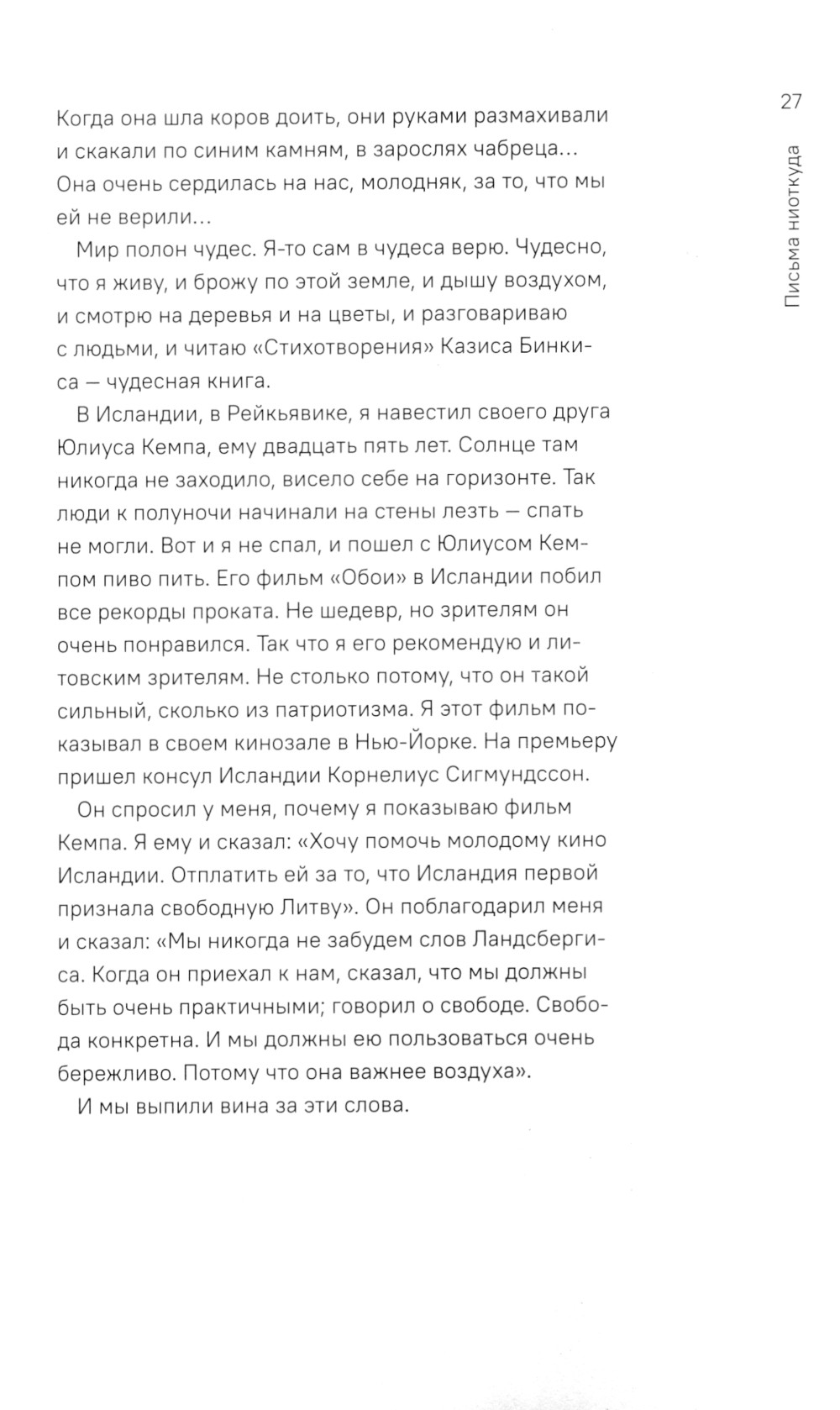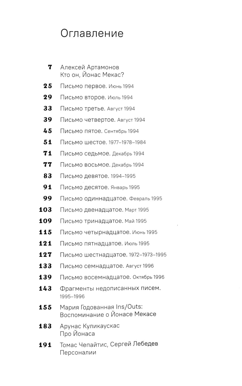 «Письма ниоткуда» - это и книга Йонаса Мекаса, и книга о Йонасе Мекасе. Первое же определение, которое о нем выдает любой справочник - «крестный отец нью-йоркского киноавангарда». То, что этот литовско-американский поэт, писатель, режиссер, критик и продюсер куда шире и глубже любого о нем представления, свидетельствуют его «Письма ниоткуда» - цикл заметок об обществе и культуре, о земле и человеке, о малых языках и народах. А также воспоминания друзей и критический очерк о его творчестве. Параллельно из снимков его друга Арунаса Куликаускаса и кадров, на которых Мекас запечатлен, складывается наглядное представление об окружающей среде и внутреннем мире художника.| Издательство | Baltrus |