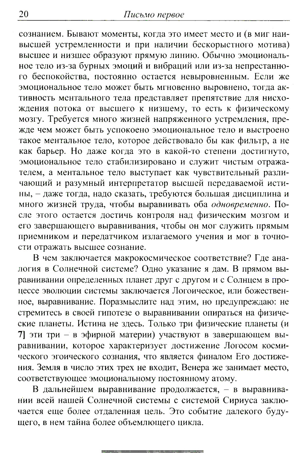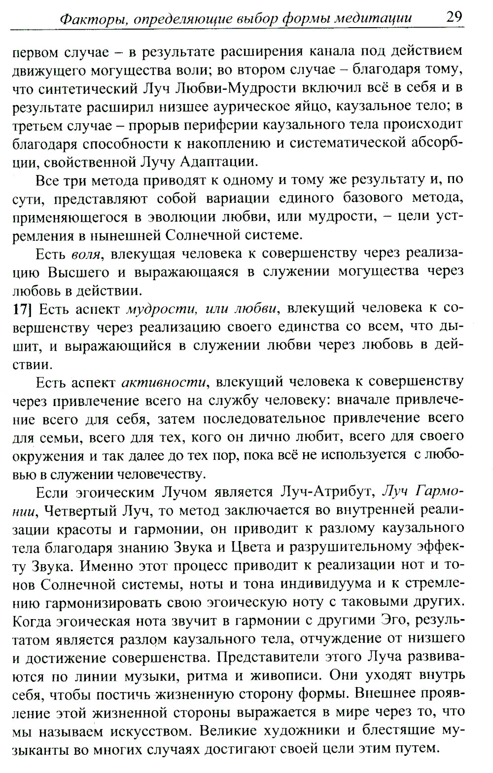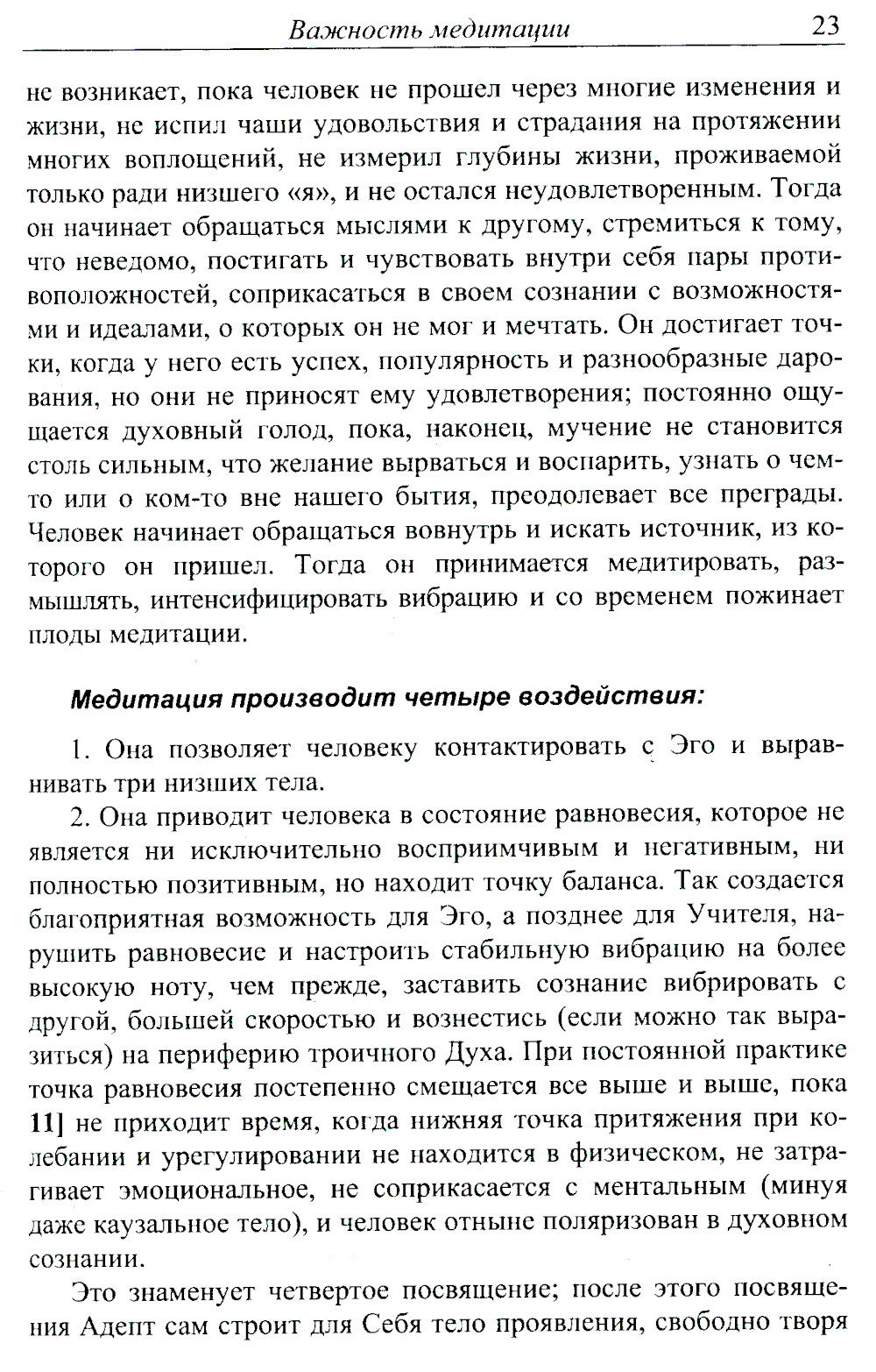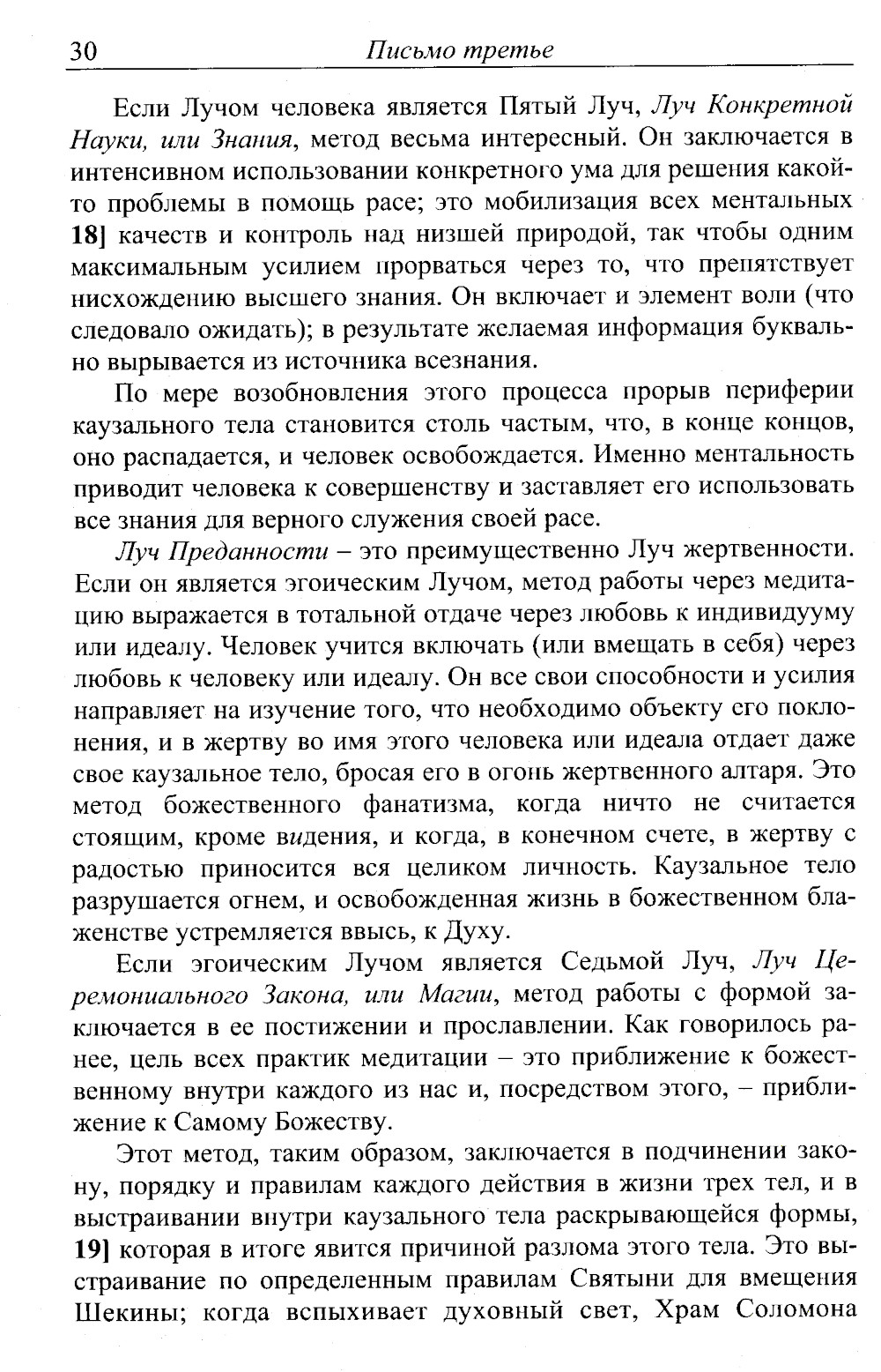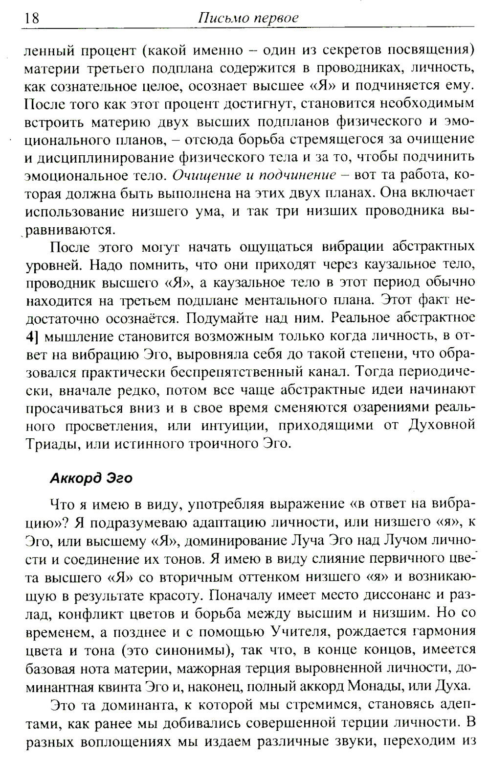 Именно в выравнивании трех проводников: физического, эмоционального и низшего ментального тел, внутри границ каузального тела и в их стабилизации там усилием воли заключается реальная работа Эго или Высшего "Я" в любом конкретном воплощении. Великие мыслители расы, истинные выразители низшего ума, это по сути своей те, у кого выровнены три низших тела; иными словами, те, чье ментальное тело бережно поддерживает выровненность двух остальных тел.| Издательство | Амрита-Русь |