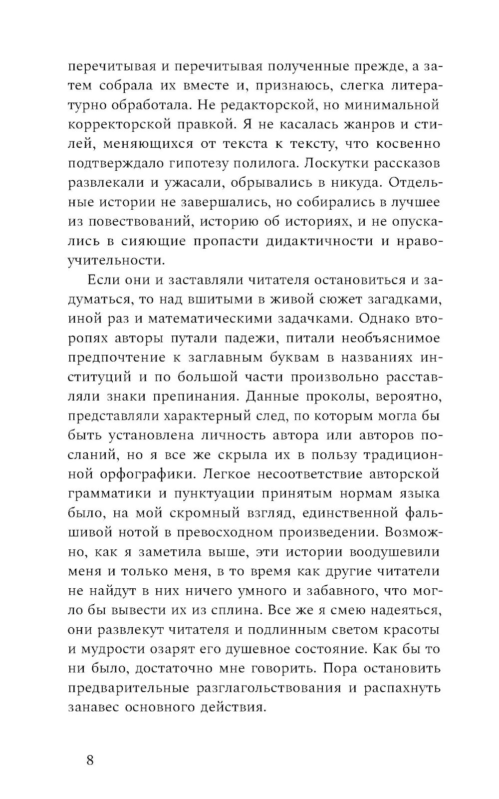 «Лоскутки рассказов развлекали и ужасали, обрывались в никуда. Отдельные истории не завершались, но собирались в лучшее из повествований, историю об историях, и не опускались в сияющие пропасти дидактичности и нравоучительности». Книга Татьяны Бонч-Осмоловской - это собранная неведомой героиней коллекция жутковатых сказок и одновременно цельное произведение, органически складывающееся из этих историй. Переосмысляя сюжеты и поэтику европейских сказочных сюжетов, классической литературы и античных мифов, автор помещает своих героев в современный тревожный мир антропологической и экологической катастрофы, населенный разнообразной флорой и фауной. Однако в центре все же оказывается растерянное и расщепленное человеческое сознание, которому в условиях неопределенности и туманности будущего остается одно - рассказывать истории. Татьяна Бонч-Осмоловская - прозаик, поэт, филолог.| Издательство | Новое литературное обозрение |
