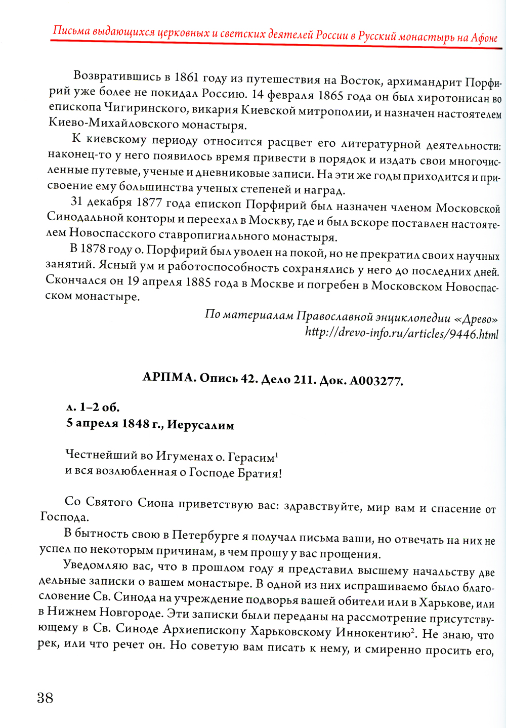 Настоящий сборник писем выдающихся церковных и светских деятелей в Русский монастырь на Афоне охватывает довольно большой промежуток времени. Самое раннее письмо, датируемое 1848 годом, принадлежит еп. Порфирию (Успенскому): приступая к научной работе по истории св. горы Афон, куда «войдет подробное повествование» о Русском монастыре, автор просит предоставить ему необходимые архивные документы. При этом он имеет искреннее намерение употребить «перо свое к славе и пользам» обители. Эта запись говорит о том, что после долгого перерыва Русская обитель снова стала привлекать к себе внимание, в том числе внимание людей ученых. Начало переписке, как и самому возрождению русского монашества, было положено старцем-духовником иеросхимонахом Иеронимом (Соломенцовым), который в 1840 году переселился со своей пустынной келлии в Русский Пантелеймонов Монастырь по просьбе греческих старцев, дабы привлечь помощь от России для обители, доведенной до крайней нищеты и убожества.| Издательство | Святая Гора Афон |