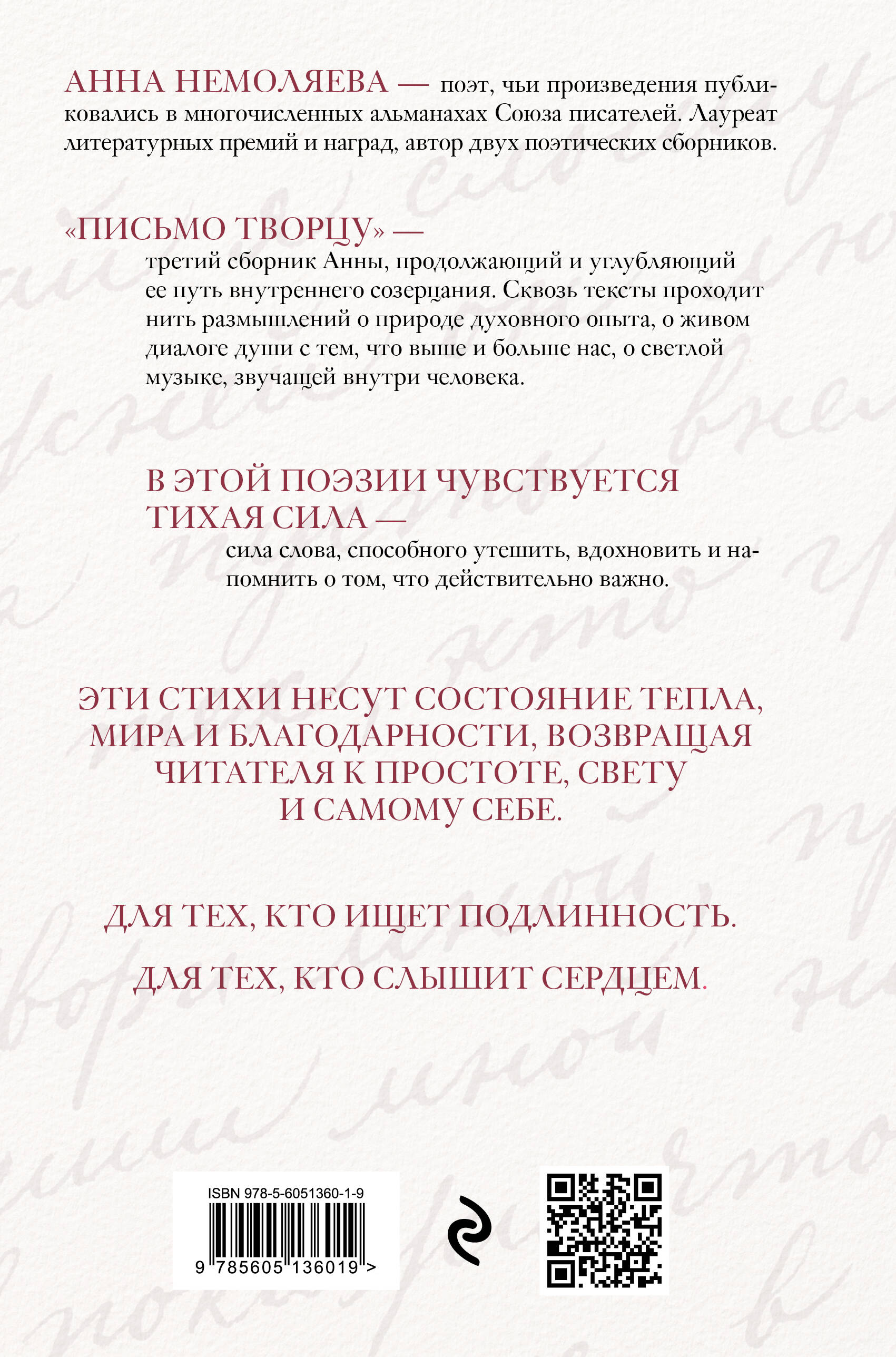 Анна Немоляева - поэт, чьи произведения публиковались в многочисленных альманахах Союза писателей. Лауреат литературных премий и наград, автор двух поэтических сборников. «Письмо Творцу» - третий сборник Анны, продолжающий и углубляющий ее путь внутреннего созерцания. Сквозь тексты проходит нить размышлений о природе духовного опыта, о живом диалоге души с тем, что выше и больше нас, о светлой музыке, звучащей внутри человека. В этой поэзии чувствуется тихая сила - сила слова, способного утешить, вдохновить и напомнить о том, что действительно важно. Эти стихи несут состояние тепла, мира и благодарности, возвращая читателя к простоте, к свету и к самому себе. Для тех, кто ищет подлинность. Для тех, кто слышит сердцем.| Издательство | ООО "Издательство "Эксмо" |