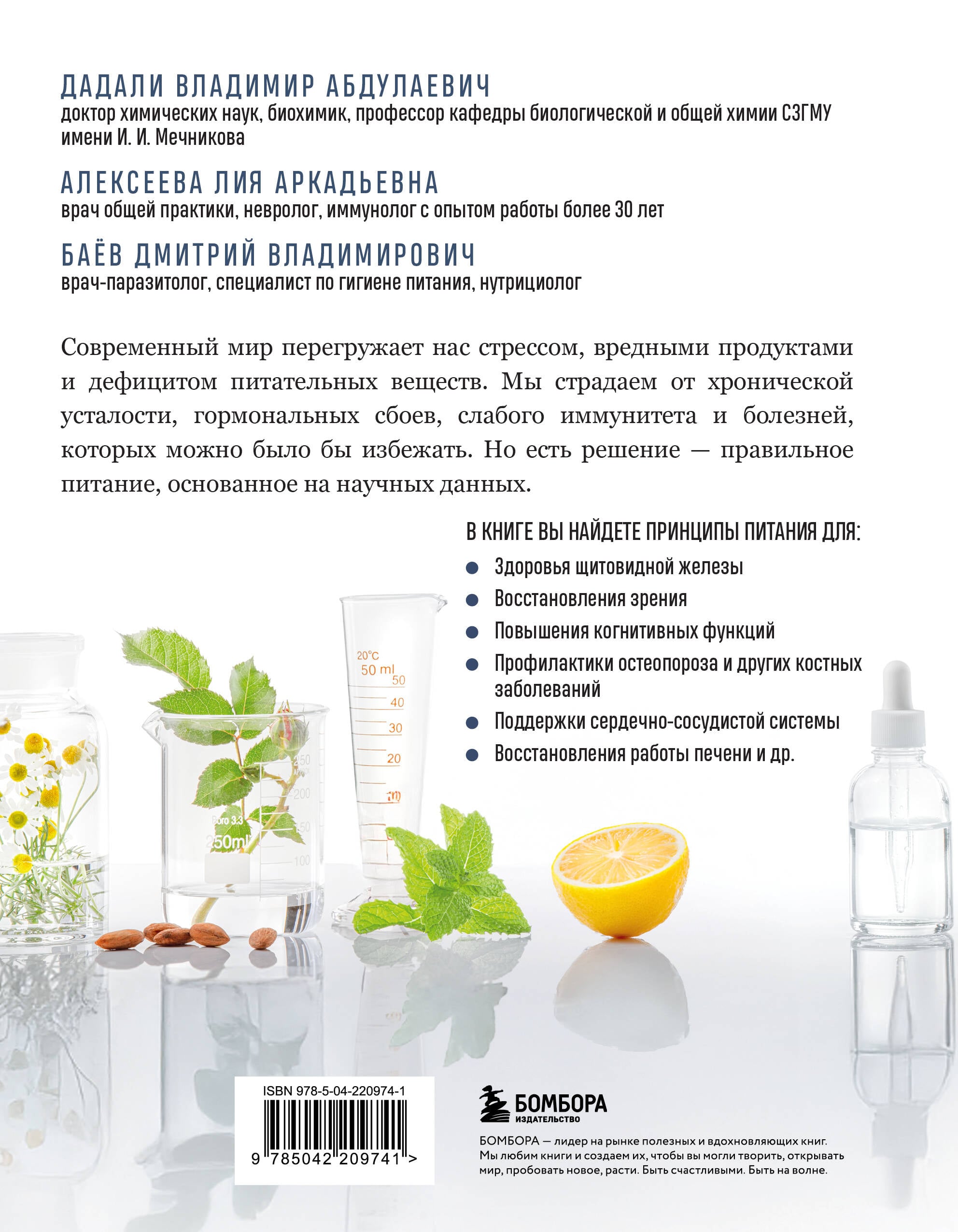 Уникальное практическое пособие от доктора химических наук, профессора Владимира Дадали, врача-иммунолога Лии Алексеевой и врача-паразитолога Дмитрия Баёва, которое перевернет ваше представление о здоровом питании и восстановлении организма. Это не очередной сборник общих советов о «полезных продуктах». Это научно обоснованная система восстановления здоровья, основанная на глубоком понимании биохимических процессов и открытиях в области нутрициологии. ВНУТРИ ВАС ЖДЕТ: 1. 17 протоколов питания для корректировки различных состояний: • заболеваний сердечно-сосудистой системы, нервной системы, печени, щитовидной железы; • половой дисфункции; • остеопороза, артрита, артроза; • сахарного диабета, избыточного веса и др. 2. Персонализированный подход: Неважно, хотите вы избавиться от синдрома хронической усталости, поддержать организм в период простудных заболеваний, скорректировать рацион во время повышенной активности или улучшить зрение с помощью питания - эта книга будет универсальным помощником и предложит подходящий протокол для каждого случая. 3. Практические инструменты: • Методы контроля порций. • Подробные таблицы содержания нутриентов в продуктах. • Понятные объяснения механизмов действия каждого нутриента. • Конкретные дозировки витаминов и минералов. • Рекомендации по выбору качественных БАДов.| Издательство | ООО "Издательство "Эксмо" |
