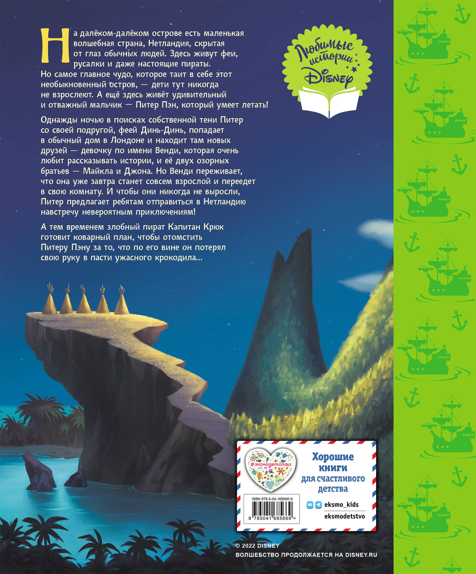 Однажды ночью в поисках собственной тени Питер со своей подругой, феей Динь-Динь, попадает в обычный дом в Лондоне и находит там новых друзей - девочку по имени Венди, которая очень любит рассказывать истории, и её двух озорных братьев - Майкла и Джона. Чтобы они никогда не выросли, Питер предлагает ребятам отправиться в Нетландию навстречу невероятным приключениям! А тем временем злобный пират Капитан Крюк готовит коварный план... Удастся ли коварному Крюку одолеть мальчишку и не попасться в лапы голодного крокодила? И что станет с потерянными мальчишками после появления девчонки на острове?| Издательство | Эксмо |