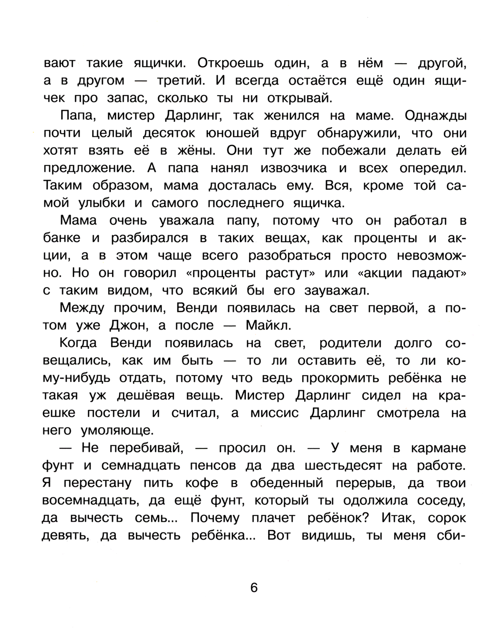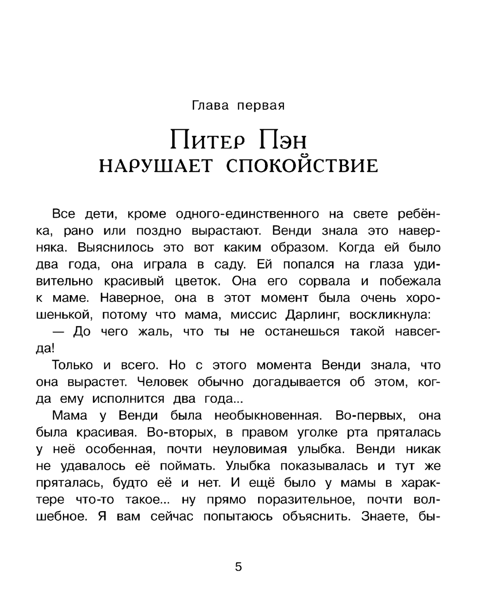 Рано или поздно все дети вырастут и станут взрослыми... Все, кроме одного-единственного мальчика по имени Питер Пэн. Мальчика, который живёт в волшебной стране Нетинебудет, умеет летать и дружит с феями. Однажды ночью он появился в детской Венди, Майкла и Джона Дарлингов и увлёк их за собой. Ну а кто из нас сможет отказаться от приглашения побывать на сказочном острове, где есть самые настоящие русалки, индейцы и пираты? И где не нужно ходить в школу и делать уроки! Замечательно, правда? Давайте и мы отправимся навстречу приключениям вместе с героями книги! Книга для детей среднего школьного возраста.| Издательство | Стрекоза |