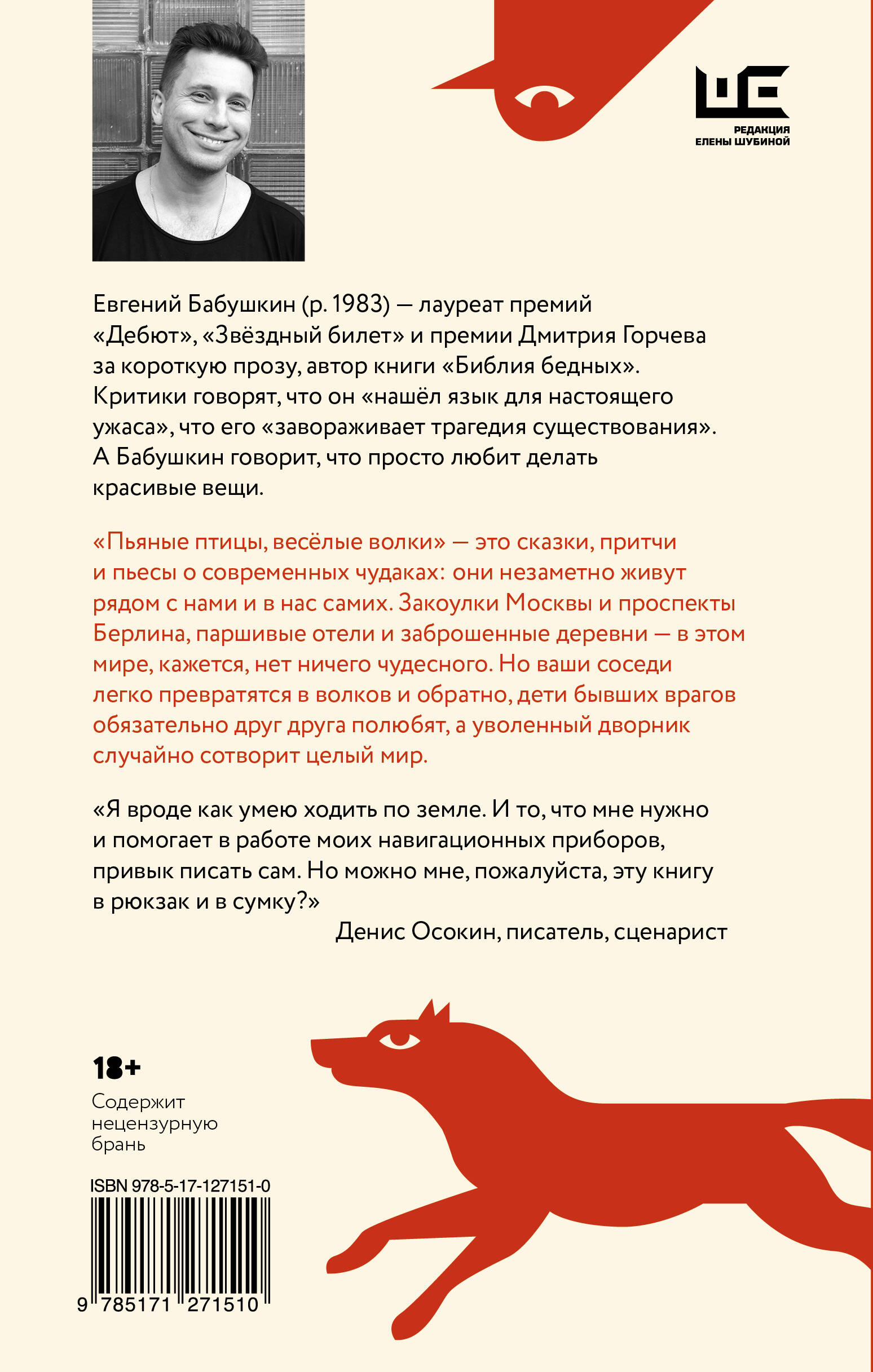 Евгений Бабушкин (р. 1983) - лауреат премий "Дебют", "Звёздный билет" и премии Дмитрия Горчева за короткую прозу, автор книги "Библия бедных". Критики говорят, что он "нашёл язык для настоящего ужаса", что его "завораживает трагедия существования". А Бабушкин говорит, что просто любит делать красивые вещи. "Пьяные птицы, весёлые волки" - это сказки, притчи и пьесы о современных чудаках: они незаметно живут рядом с нами и в нас самих. Закоулки Москвы и проспекты Берлина, паршивые отели и заброшенные деревни - в этом мире, кажется, нет ничего чудесного. Но ваши соседи легко превратятся в волков и обратно, дети бывших врагов обязательно друг друга полюбят, а уволенный дворник случайно сотворит целый мир. "Я вроде как умею ходить по земле. И то, что мне нужно и помогает в работе моих навигационных приборов, привык писать сам. Но можно мне, пожалуйста, эту книгу в рюкзак и в сумку?" Денис Осокин, писатель, сценарист