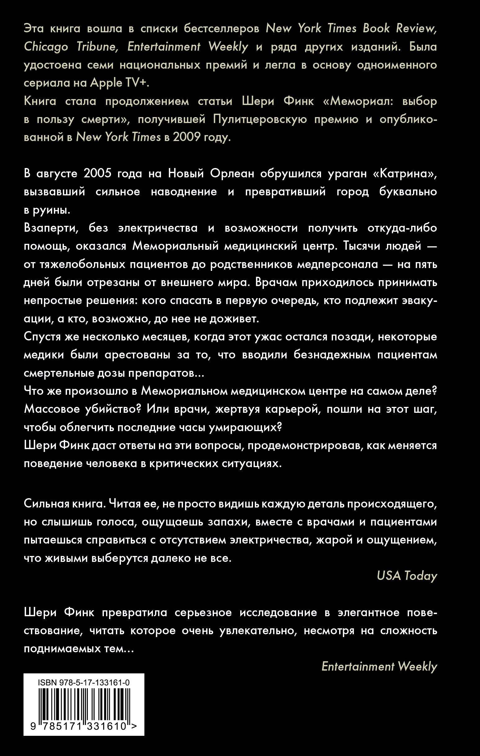 Книга выросла из статьи в The New York Times Magazine, завоевавшей Пулитцеровскую премию. Книга «Пять дней после катастрофы» также стала обладательницей трех престижных премий, в том числе Премии национального круга книжных критиков. Читайте книгу, смотрите сериал! В августе 2022 года на сервисе Apple TV+ вышел мини-сериал с Верой Фармигой и Черри Джонс в главных ролях.| Издательство | ИЗДАТЕЛЬСТВО "АСТ" |