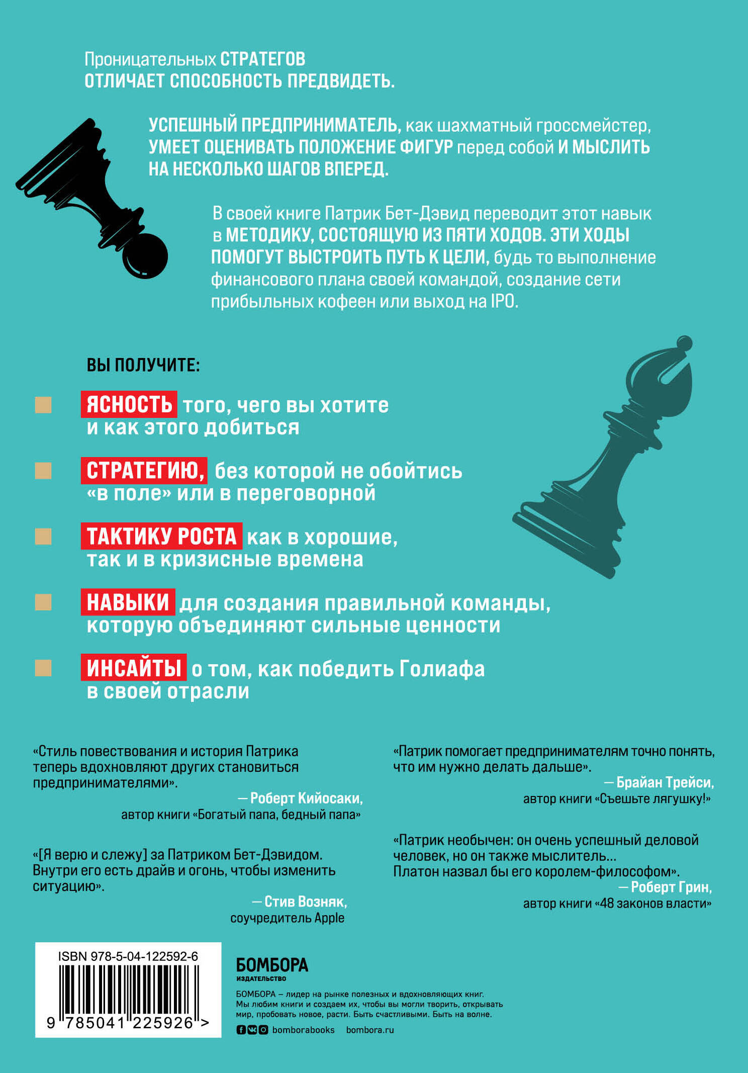 Патрик Бет-Дэвид - предприниматель, финансовый консультант и создатель Valuetainment, канала для предпринимателей № 1 на YouTube (более 3 млн подписчиков). Проницательных стратегов отличает способность предвидеть. Успешный предприниматель, как шахматный гроссмейстер, умеет оценивать положение фигур перед собой и мыслить на несколько шагов вперед. В своей книге Патрик Бет-Дэвид переводит этот навык в методику, состоящую из пяти ходов. Эти ходы помогут выстроить путь к цели, будь то выполнение финансового плана своей командой, создание сети прибыльных кофеен или выход на IPO. Вы получите: 1. ЯСНОСТЬ относительно того, чего вы хотите и как этого добиться. 2. СТРАТЕГИЮ, без которой не обойтись «в поле» или/и в переговорной. 3. ТАКТИКУ РОСТА как в хорошие, так и в кризисные времена. 4. НАВЫКИ для создания правильной команды, которую объединяют сильные ценности. 5. ИНСАЙТЫ о том, как победить Голиафа в своей отрасли. «Патрик - один из самых интересных мыслителей, с которыми мне приходилось общаться». - Рэй Далио, автор книги «Принципы. Жизнь и работа» «[Я верю и слежу] за Патриком Бет-Дэвидом. Внутри него есть драйв и огонь, чтобы изменить ситуацию». - Стив Возняк, соучредитель Apple «Стиль повествования и история Патрика теперь вдохновляют других становиться предпринимателями». - Роберт Кийосаки, автор книги «Богатый папа, бедный папа» «Патрик помогает предпринимателям точно понять, что им нужно делать дальше». - Брайан Трейси, автор книги «Съешьте лягушку!» «Патрик необычен: он очень успешный деловой человек, но он также мыслитель... Платон назвал бы его королем-философом». - Роберт Грин, автор книги «48 законов власти»| Издательство | ООО "Издательство "Эксмо" |
