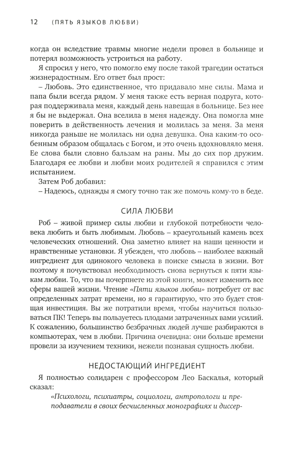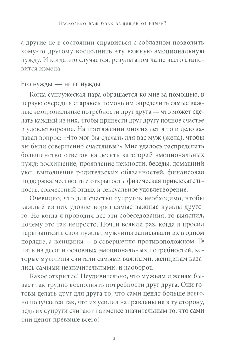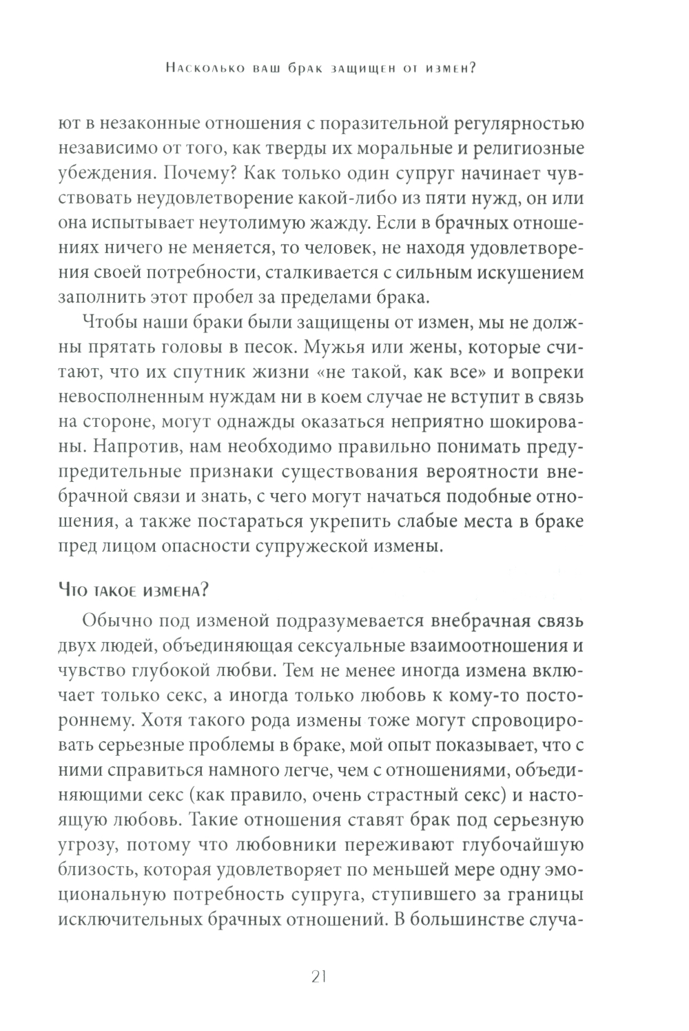 Комплект из 2-х книг. «Пять языков любви»: Любовь можно проявлять по-разному. Доктор Гэри Чепмер утверждает, что существует пять языков любви: слова поощрения, время, подарки, помощь, прикосновения. Вы стараетесь показать супругу, что любите его, а он как будто ничего не замечает... Может быть, вы просто говорите на разных языках? Возможно, ваш муж хочет, чтобы вы ему посочувствовали, а вы вместо этого готовите вкусный ужин. Возможно, вашей жене хочется проводить с вами побольше времени, а роскошные букеты, которые вы преподносите каждый вечер, ей не нужны. В конце книги вы найдете руководство по обсуждению, которое поможет вам лучше разобраться в прочитанном. Вы и заметить не успеете, как научитесь понимать язык другого, выражать ему любовь, и вскоре почувствуете, что и вас любят. «Его нужды, ее нужды»: Счастливый брак требует умения и заботы. Но мужчины склонны пытаться удовлетворить те нужды женщин, которые на их взгляд важнее, женщины делают то же самое. Проблема в том, что нужды мужчин и женщин зачастую сильно отличаются, и мы напрасно тратим силы, пытаясь восполнить не то, что нужно. Эта книга поможет вам выявить самые важные эмоциональные потребности, уникальные для вас и вашего супруга и научиться восполнять их. Вы сможете защитить свой брак от измен, создав отношения, где сохраняется романтика, а супруги с каждым годом становятся ближе друг к другу. Предложите вашей второй половине читать книгу вместе с вами, заполнять анкеты и отвечать на вопросы в конце каждой главы. Вы даже можете выделять текст по мере прочтения двумя разными маркерами, чтобы показать друг другу, что для вас важнее всего.