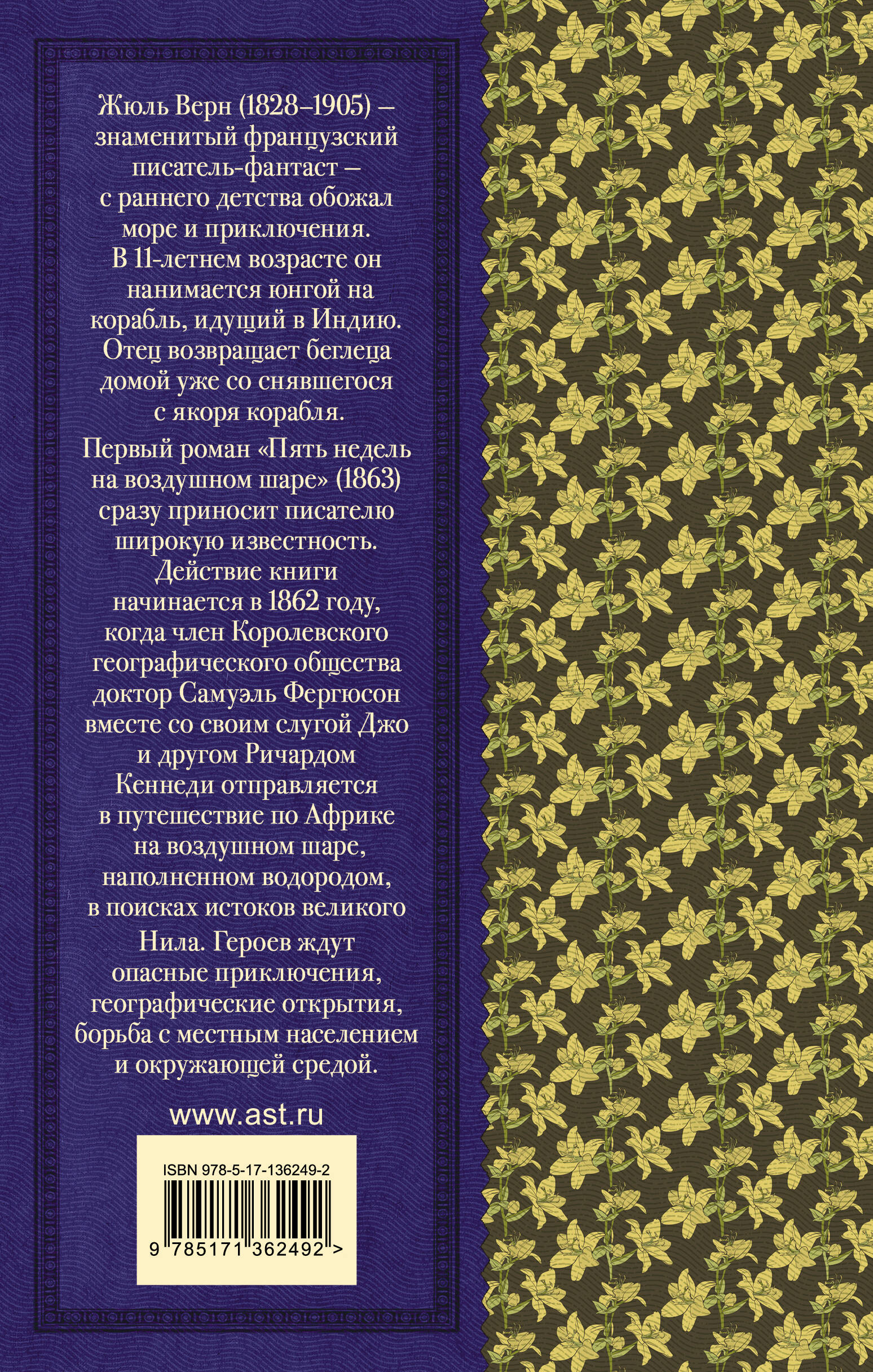 Первый роман «Пять недель на воздушном шаре» (1863) сразу приносит писателю широкую известность. Действие книги начинается в 1862 году, когда член Королевского географического общества доктор Самуэль Фергюсон вместе со своим слугой Джо и другом Ричардом Кеннеди отправляется в путешествие по Африке (к тому времени малоизведанной) на воздушном шаре, наполненном водородом, в поисках истоков великого Нила.