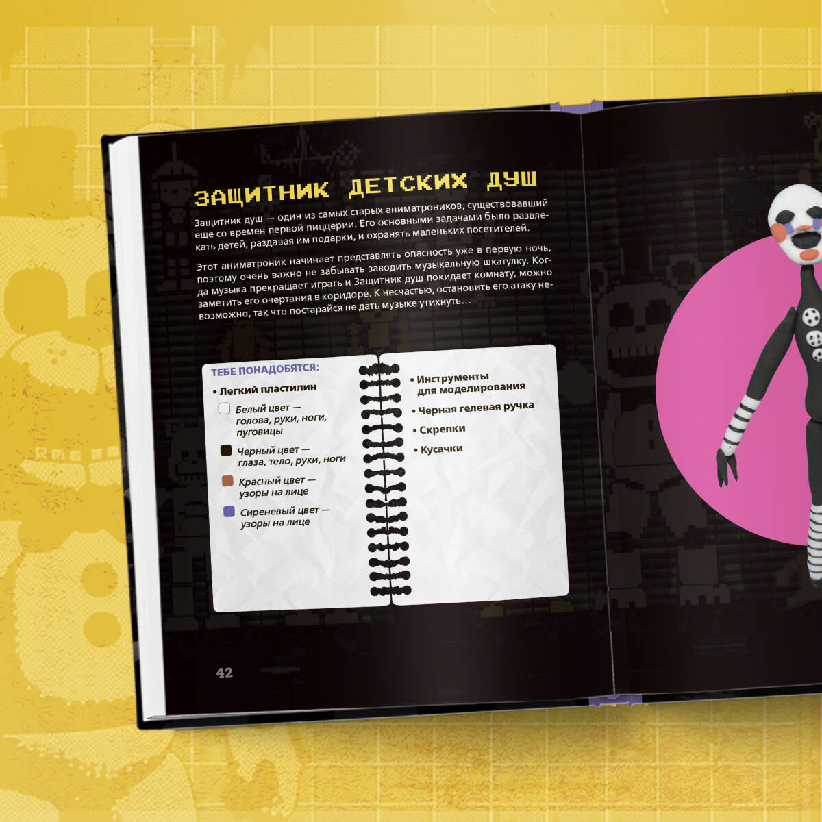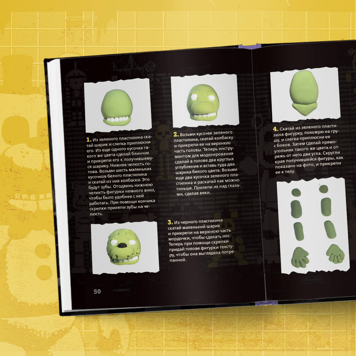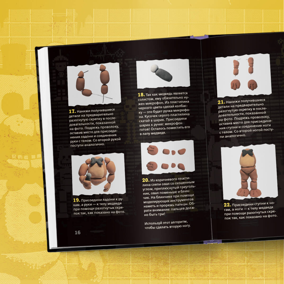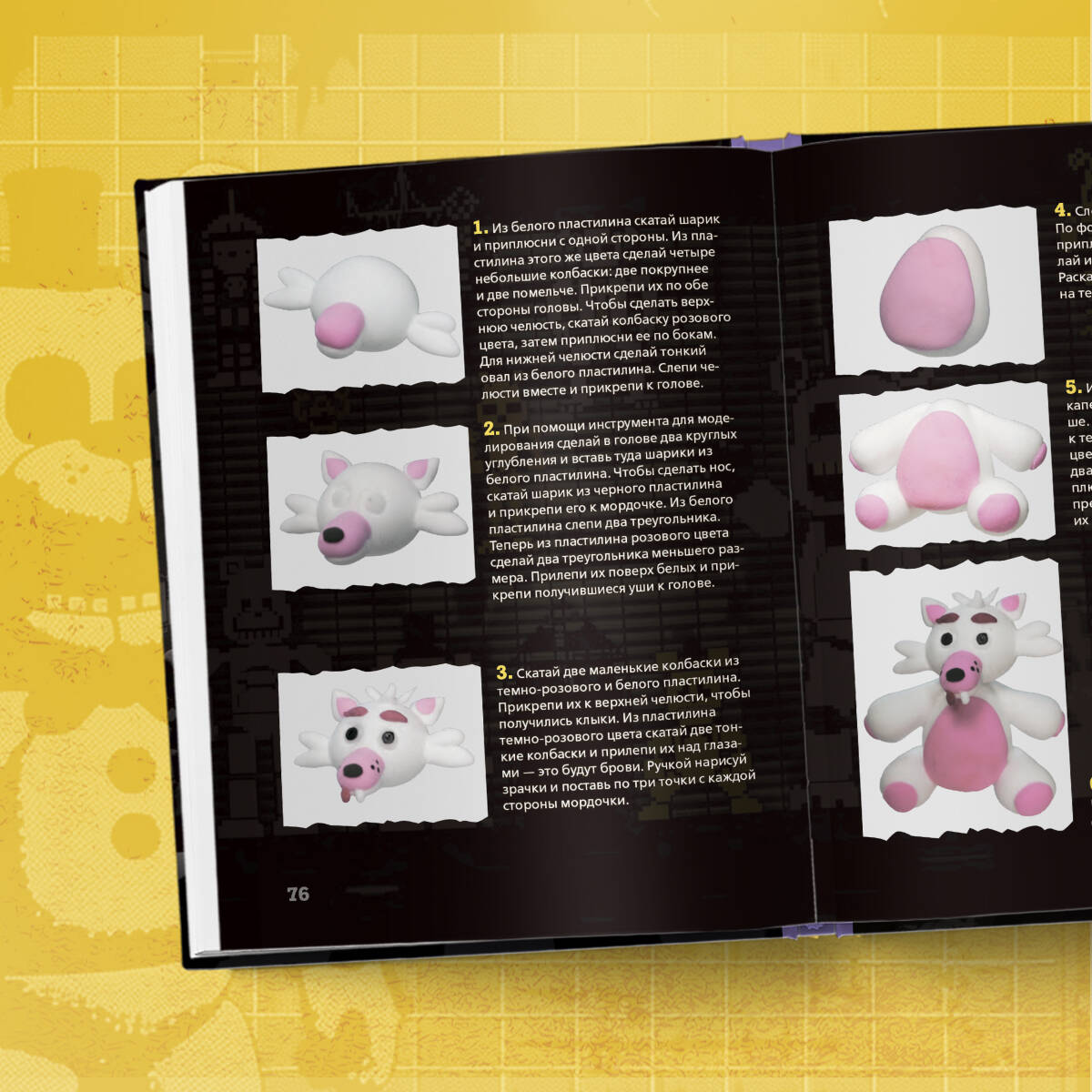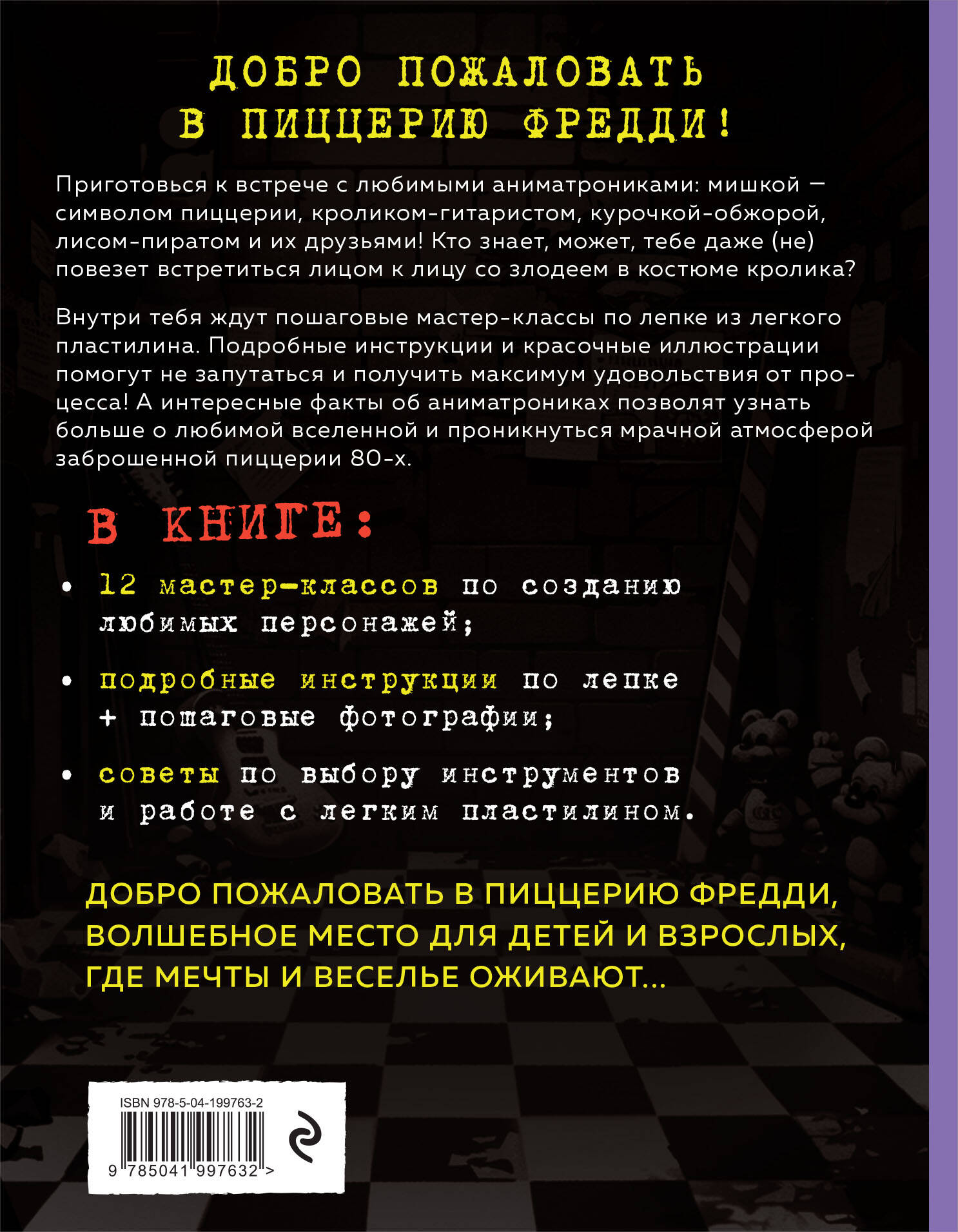 Слепи любимых аниматроников из пластилина! Примерь на себя роль ночного охранника таинственной пиццерии и встреться лицом к лицу с роботами, что бродят по ее коридорам глубокой ночью. На страницах тебя ждут мишка - символ пиццерии, кролик-гитарист, курочка-обжора, лис-пират и их друзья! Кто знает, может, тебе даже (не)повезет встретиться лицом к лицу со злодеем в костюме кролика? Внутри тебя ждут понятные пошаговые мастер-классы по лепке из легкого пластилина. Ты узнаешь все тонкости и секреты работы с этим материалом. Подробные инструкции и красочные иллюстрации помогут не запутаться и получить максимум удовольствия от процесса! А интересные факты об аниматрониках, которые ты найдешь на страницах, позволят узнать больше о любимой вселенной и проникнуться мрачной атмосферой заброшенной пиццерии 80-х. Внутри: • 12 мастер-классов по созданию любимых персонажей. • Подробные инструкции по лепке + пошаговые фотографии. • Советы по выбору инструментов и работе с легким пластилином. Добро пожаловать в Пиццерию Фредди, волшебное место для детей и взрослых, где мечты и веселье оживают...| Издательство | ООО "Издательство "Эксмо" |