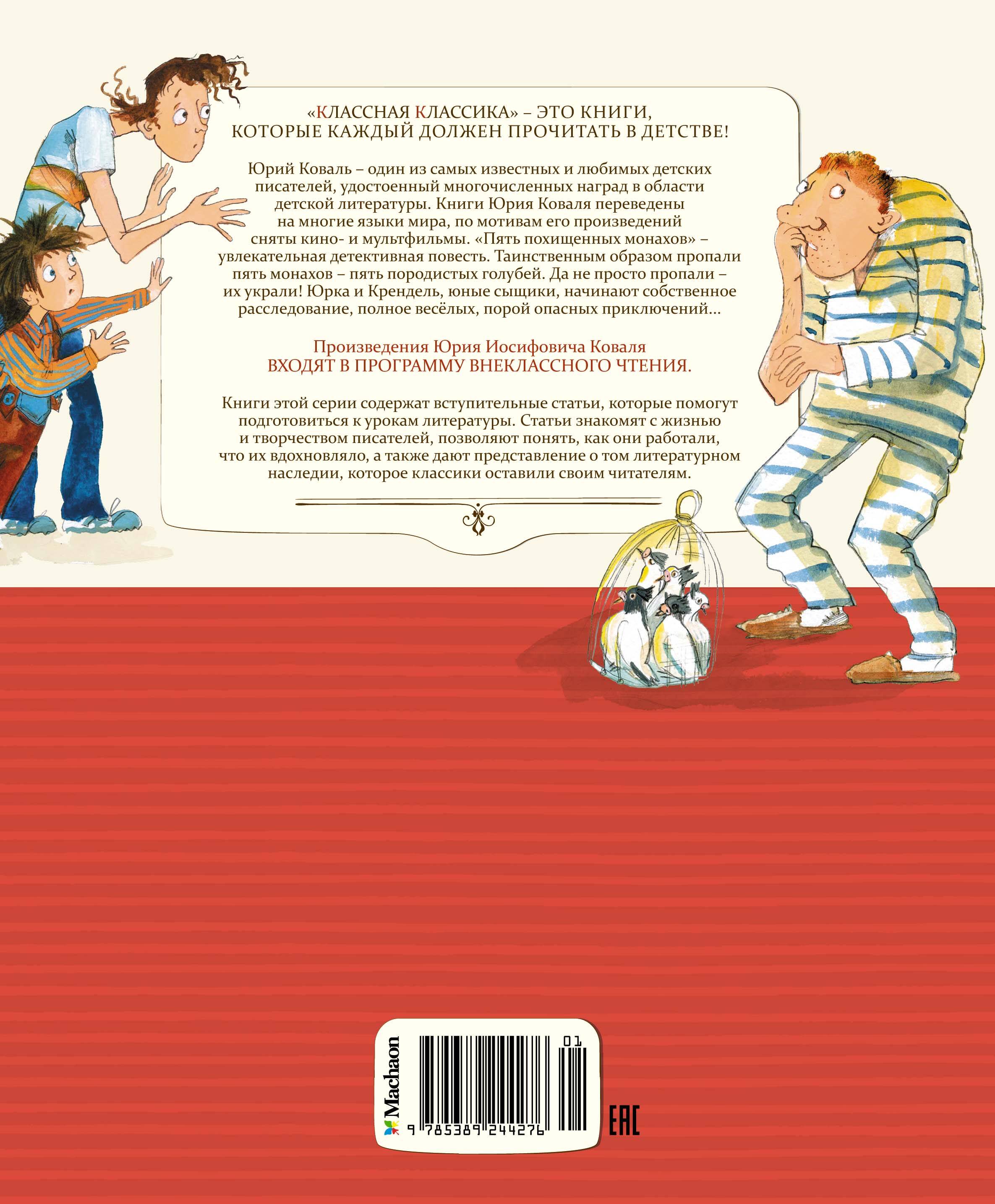Юрий Коваль - один из самых известных и любимых детских писателей, удостоенный многочисленных наград в области детской литературы, обладатель Почётного диплома международного конкурса им. Г.-Х. Андерсена. Книги Юрия Коваля переведены на многие языки мира, по мотивам его произведений сняты кино- и мультфильмы. "Пять похищенных монахов" - увлекательная, по-настоящему детективная повесть. Таинственным образом пропали пять монахов - пять породистых голубей. Да не просто пропали - их украли! Юрка и Крендель, юные сыщики, начинают собственное расследование, полное весёлых, но порой опасных приключений. Удастся ли мальчишкам выйти на след дерзких грабителей и вернуть птиц?..| Издательство | Азбука-Аттикус Издат.группа ООО |