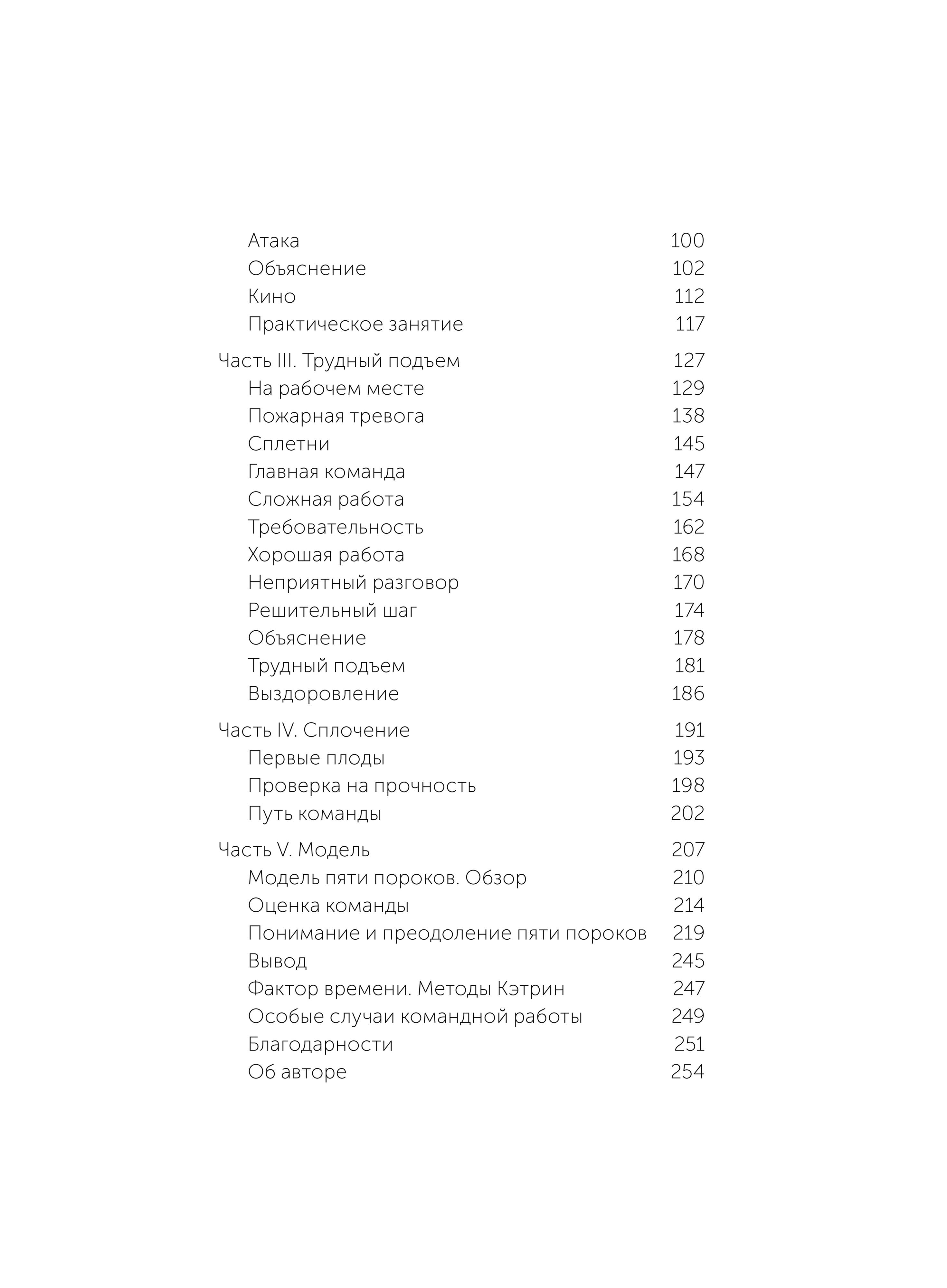 Глава одной высокотехнологичной компании подал в отставку, поскольку работа компании при нем разваливалась на глазах. "Менеджеры достигли совершенства в искусстве подставлять друг друга. Команда утратила дух единства и товарищества, его сменила нудная обязаловка. Любая работа затягивалась, качество падало". Через некоторое время в компанию приходит новый руководитель и обстановка еще больше накаляется - Кэтрин полна решимости разобраться с проблемами команды менеджеров, которые почти привели успешную компанию к краху. Какой ценой, и главное, каким образом ей это в итоге удается, и рассказывает Патрик Ленсиони. Почему возникают "пять пороков команды" - взаимное недоверие, нетребовательность, безответственность, боязнь конфликта и безразличие к результатам, как их диагностировать и что с ними делать? В первой части книги эти вопросы решает Кэтрин со своей командой, а во второй автор приводит подробное описание этих "пять пороков команды" и методы их устранения. Почему мы решили издать эту книгу Потому что она может существенно повысить эффективность работы вашей команды Потому что в ней сочетаются практическая польза и занимательное чтение - за это мы и любим бизнес-романы Для кого эта книга Для всех, кто работает в команде и с командой - от руководителя до рядового сотрудника От автора Не финансы, не тактика, не технологии, а именно работа команды в силу своего потенциала и неповторимости является основным звеном деятельности компании. Мой друг, руководитель организации, приносящей миллиарды долларов прибыли, однажды сказал: "Добейтесь того, чтобы все сотрудники вашей компании двигались в одном направлении, и вы овладеете любой отраслью промышленности, любым рынком, всегда и везде". Когда я повторял это замечательное изречение руководителям, с которыми мне доводилось работать, они все согласно кивали. Но я чувствовал, что в глубине души они не верят, что подобное осуществимо. Однако именно команде принадлежит решающая роль. Правда, в работе команды по сей день остается много загадок - и это несмотря на то, что на протяжении многих лет сплочением людей занимаются школьные учителя, спортивные тренеры, средства массовой информации. Дело в том, что совместная деятельность людей, каждый из которых обладает собственным характером и различными недостатками, затруднена по определению. Но все же это не значит, что команда обречена, совсем нет. Создание и плодотворная работа сильной команды вполне возможны. Но это трудный и подчас болезненный процесс. Работу команды можно описать как согласованную деятельность людей. Достичь согласованности теоретически несложно, но на практике трудноосуществимо. Успех приходит только к тем, кто в процессе кропотливого ежедневного труда преодолел всевозможные недостатки и слабости, свойственные природе человека, которые и порождают проблемы внутри команды. Как и другие мои книги, "Пять пороков команды" начинаются с рассказа о вымышленной организации, которая тем не менее вполне могла бы существовать в реальности. Мне кажется, что такое начало поможет читателю вникнуть в повествование, поставить себя на место героев и понять, как применять предлагаемые мною принципы в реальной жизни, когда огромные объемы работы и ежедневные раздоры делают трудноисполнимыми даже простейшие задачи. В после
