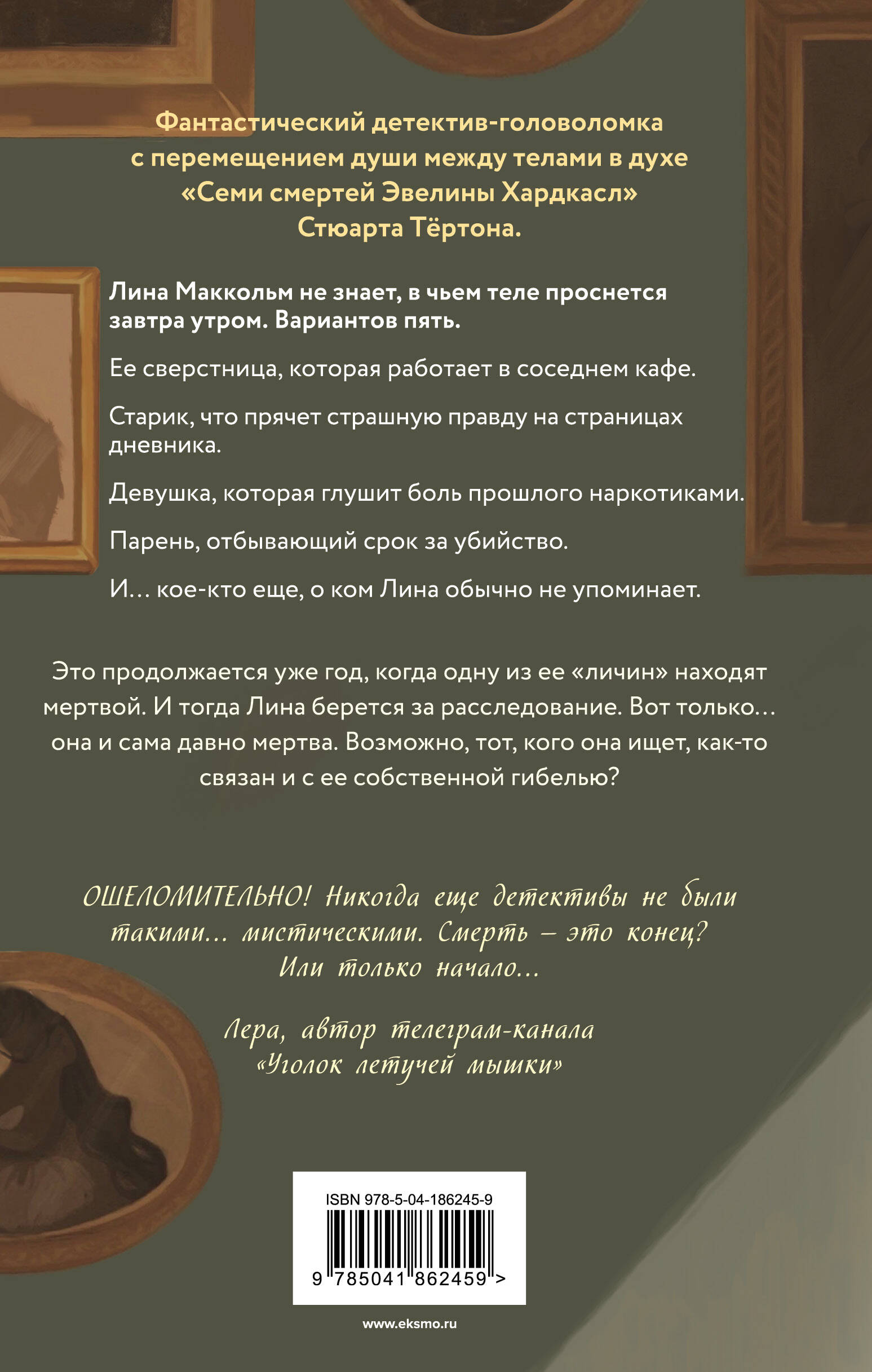 Фантастический детектив-головоломка с перемещением души между телами в духе «Семи смертей Эвелины Хардкасл» Стюарта Тёртона. Лина Маккольм не знает, в чьем теле проснется завтра утром. Вариантов пять. Ее сверстница, которая работает в соседнем кафе. Старик, что прячет страшную правду на страницах дневника. Девушка, которая глушит боль прошлого наркотиками. Парень, отбывающий срок за убийство. И… кое-кто еще, о ком Лина обычно не упоминает. Это продолжается уже год, когда одну из ее «личин» находят мертвой. И тогда Лина берется за расследование. Вот только… она и сама давно мертва. Возможно, тот, кого она ищет, как-то связан и с ее собственной гибелью? ------------------------------ «Я как будто оказалась в лабиринте, выбраться из которого можно, лишь дочитав книгу до конца». - Катя, автор блога «В мире книг и Гарри Поттера» «Напряжённый мистический триллер, где несколько судеб сплетутся в общую историю случайностей и закономерностей. Книга-лабиринт, в которой каждый поворот обещает очередное ошеломляющее открытие». - Даша, автор телеграм-канала «Книжный Плюшкин» «Захватывающее расследование в стиле сериала "Квантовый скачок". Авторский стиль - на высоте, и оторваться невозможно!» - Эмили, автор телеграм-канала «Безумный книжник» «Вы не поймёте, как прочитаете всю историю и окажетесь на последних страницах». - Аня, автор телеграм-канала «anyabooklove» «ОШЕЛОМИТЕЛЬНО! Никогда ещё детективы не были такими… мистическими. Смерть - это конец? Или только начало…» - Лера, автор телеграм-канала «Уголок летучей мышки»