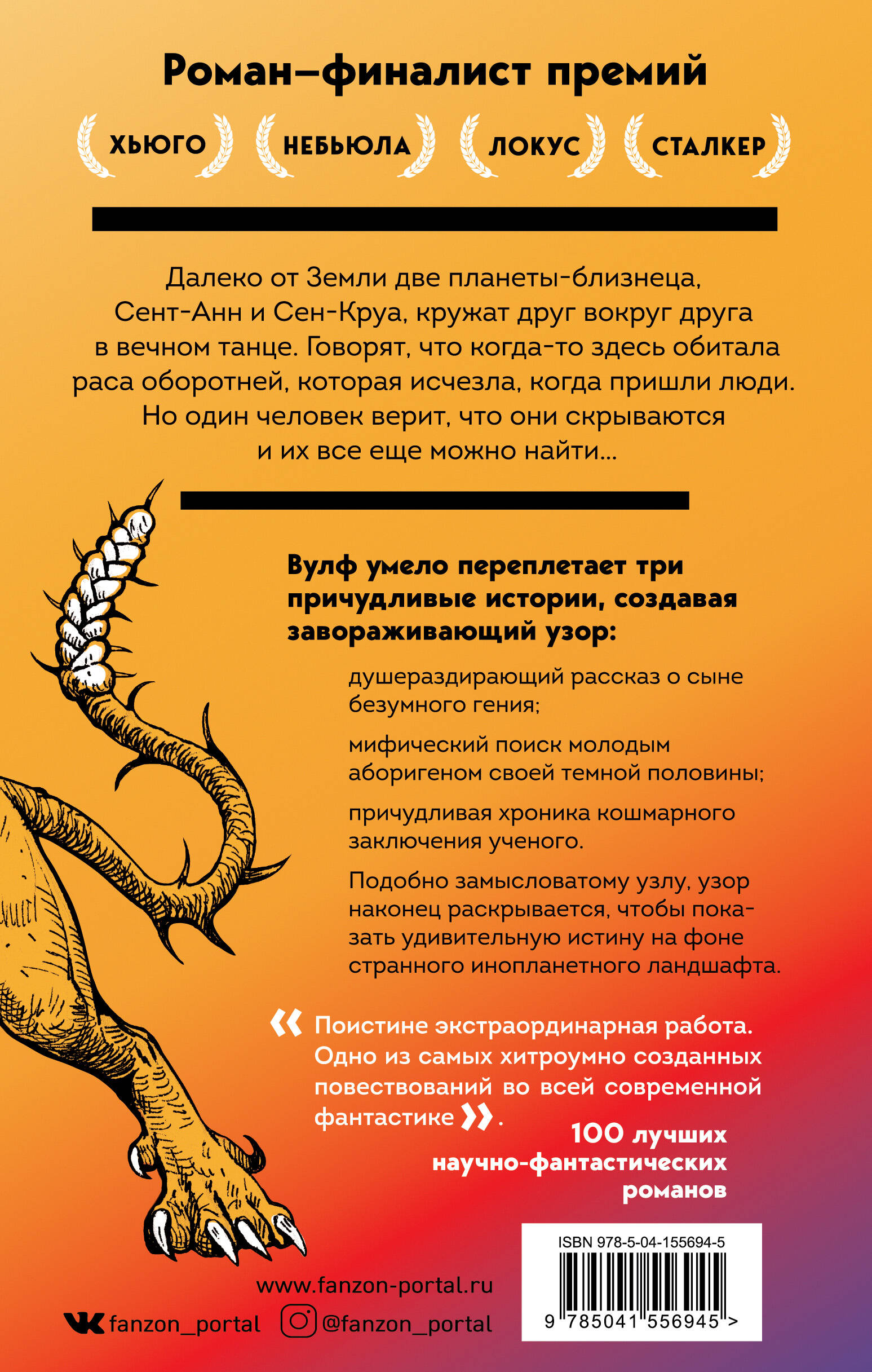 Роман-финалист премий «Хьюго», «Небьюла», «Локус», «Сталкер». Роман Джина Вулфа состоит из трех связанных частей, полных изящных размышлений о самоидентичности, подобии и чуждости. Место действия - яркие колониальные миры Сен-Круа и Сент-Анн, планеты-близнецы, балансирующие на общей орбите. Сыновья содержателя борделя обсуждают геноцид и замышляют убийство; юного инопланетного странника преследует его двойник-тень; политический заключенный пытается подтвердить свою личность, и не в последнюю очередь - самому себе. Клоны, загруженные в роботов личности, инопланетяне, которые, возможно, так успешно имитировали людей, что сами забыли о том, кто они такие, французская культура безжалостных колонизаторов - есть много способов потерять себя и худшее - думать, что свобода состоит в обладании другими людьми. «Легко поддаться впечатлению от интеллектуальной игры потрясающей книги Вулфа и забыть, что всегда был самым высоконравственным из фантастов». - Amazon.co.uk «Это - удивительная книга, наполненная образами и загадками, оставляющая после себя щемящее чувство грусти и тревоги, заставляющая думать и переживать, возвращаться и перечитывать, пытаясь ухватить ускользающие миражи и намеки». - FantLab «Джин Вулф уникален. Если бы было сорок или пятьдесят таких первоклассных авторов - нет, давайте будем благоразумны и попросим в Вышестоящей Инстанции только четырех или пятерых, то вся Американская литература была бы чрезвычайно обогащена». - Chicago Sun-Times «Одно из главных художественных произведений десятилетия… Роман Вулфа, с его неуловимостью и красотой, преследует человека еще долго после его прочтения». - Памела Сарджент «Богатое творческое исследование природы идентичности и индивидуальности». - Энциклопедия научной фантастики «Фантастика для думающего читателя… Стиль высокой литературы, идеи утонченные и продуманные». - Amazing SF «Джин Вулф - величайший из ныне живущих англоязычных авторов. Давайте повторю: Джин Вулф - величайший из ныне живущих англоязычных авторов! Я совершенно серьёзно. Шекспир превосходит Вулфа как стилист, Мелвилл - по значимости для истории американской литературы, а Диккенс более виртуозно выписывал характеры. Но из ныне живущих авторов никто и близко не сравнится с Вулфом по великолепию прозы, ясности идей и глубине заложенных смыслов». - Майкл Суэнвик «Если кто-то из современных беллетристов и заслуживает звания Великого Писателя, то это, несомненно, Вулф... который читается, как Диккенс, Пруст, Киплинг, Честертон и Набоков, сплавленные воедино, а потом приправленные влияниями самых разных фантастов - от Герберта Уэллса до Джека Вэнса, от Г. Ф. Лавкрафта до Деймона Найта... В общем и целом, он один из лучших американских авторов... Модернист или постмодернист, формальный аллегорист или анатом человеческой души - он просто чудо, истинный талант!» - Washington Post Book World «Умные писатели бывают двух типов. Одни выпячивают свой ум, а другим совершенно незачем его выпячивать. Джин Вулф - из вторых, причём интеллект для него не главное, главное - рассказать историю. Он умён не для того, чтобы выставить вас дураками, а для того, чтобы вы тоже поумнели». - Нил Гейман «Один из 100 лучших научно-фантастических романов… Поистине экстраординарная работа. Одно из самых хитроумно созданных повествований во всей современной фантастике, шедевр д