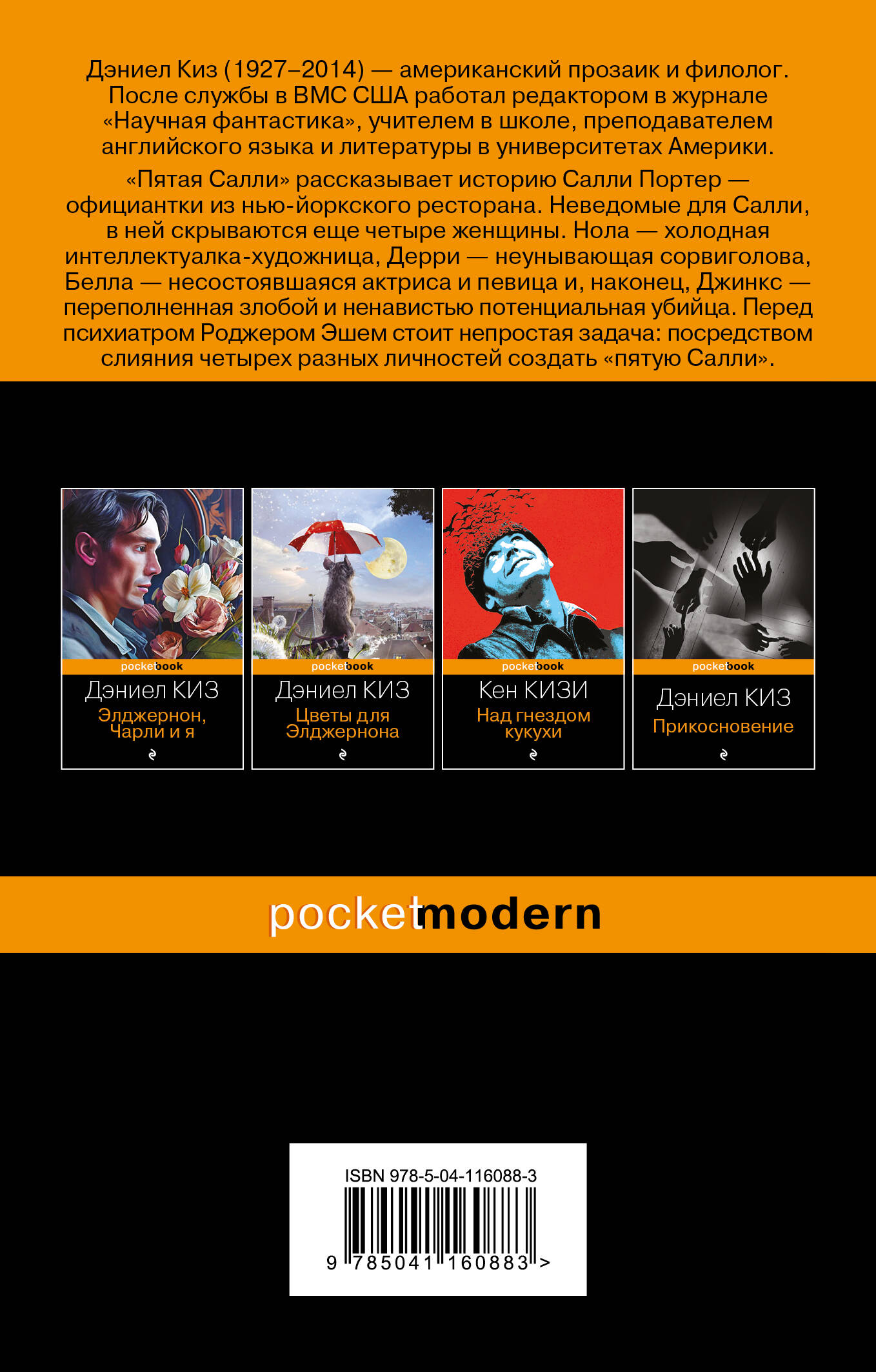 Дэниел Киз, долгое время изучавший психопатологии, провел немало часов в психиатрических лечебницах со специалистами, работавшими с пациентами, у которых наблюдались редкие расстройства. В результате появились его романы, в которых детально показан самый хрупкий, самый непредсказуемый и самый интересный механизм - человеческая психика. «Пятая Салли», написанная за два года до знаменитой «Таинственной истории Билли Миллигана», рассказывает историю Салли Портер - официантки из нью-йоркского ресторана. На первый взгляд это обычная, ничем не примечательная женщина. Но, неведомые для Салли, в ней скрываются еще четыре женщины. Нола - холодная интеллектуалка-художница, Дерри - неунывающая сорвиголова, Белла - сексуально озабоченная несостоявшаяся актриса и певица, и, наконец, Джинкс - переполненная злобой и ненавистью потенциальная убийца. Всякий раз в трудной ситуации Салли Портер чувствует сильную головную боль и теряет сознание. Тогда-то и появляется кто-нибудь из ее альтеров. Если появляется симпатичный мужчина, на сцену выпархивает Белла. Если нужно решить проблему, требующую интеллектуальных усилий, за дело берется Нола. А если требуется дать отпор насильнику, неизбежно вмешательство беспощадной Джинкс. Перед психиатром Роджером Эшем стоит непростая задача: посредством слияния четырех разных личностей создать «пятую Салли».| Издательство | ООО "Издательство "Эксмо" |