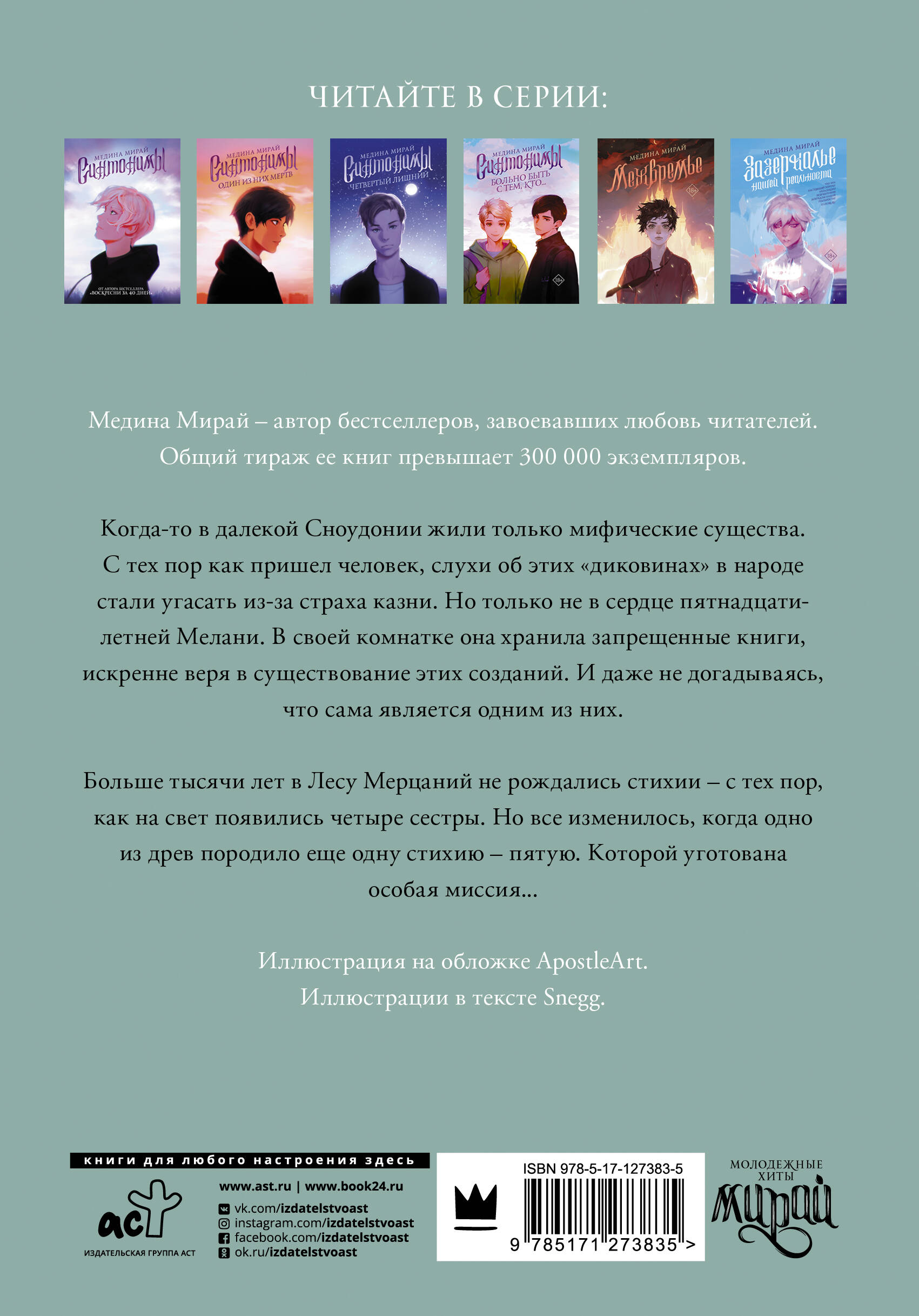 Когда-то в далекой Сноудонии жили только мифические существа. С тех пор как пришел человек, слухи об этих "диковинах" в народе стали угасать из-за страха казни. Но только не в сердце пятнадцатилетней Мелани. В своей комнатке она хранила запрещенные книги, искренне веря в существование этих созданий. И даже не догадываясь, что сама является одним из них. Больше тысячи лет в Лесу Мерцаний не рождались стихии - с тех пор, как на свет появились четыре сестры. Но все изменилось, когда одно из древ породило еще одну стихию - пятую. Которая даже не представляет, кто она и какая миссия ей уготована...| Издательство | Издательство "АСТ" |