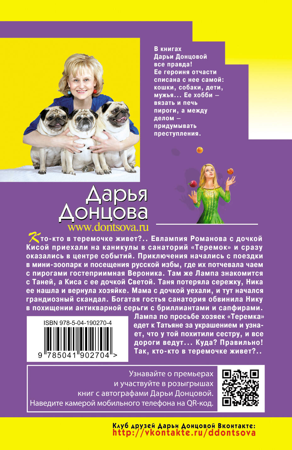 Кто-кто в теремочке живет?.. Евлампия Романова с дочкой Кисой приехали на каникулы в санаторий «Теремок» и сразу оказались в центре событий. Приключения начались с поездки в мини-зоопарк и посещения русской избы, где их потчевала чаем с пирогами гостеприимная Вероника. Там же Лампа знакомится с Таней, а Киса - с ее дочкой Светой. Таня потеряла сережку, Ника ее нашла и вернула хозяйке. Мама с дочкой уехали, и тут начался грандиозный скандал. Богатая гостья санатория обвинила Нику в похищении антикварной серьги с бриллиантами и сапфирами. Лампа по просьбе хозяек «Теремка» едет к Татьяне за украшением и узнает, что у той похитили сестру, и все дороги ведут... Куда? Правильно! Так, кто-кто в теремочке живет?.. Дарья Донцова - самый популярный и востребованный автор в нашей стране, любимица миллионов читателей. В России продано более 200 миллионов экземпляров ее книг. Детективы Дарьи Донцовой написаны в особой манере: помимо интереснейшего сюжета, в них всегда присутствует тонкий юмор, здравый оптимизм и безусловная вера в торжество добра над злом. Это все, что нужно для отдыха, релаксации и душевного успокоения. Прочтите книги Дарьи, и ваши сердца и души наполнятся светом, оптимизмом, радостью, уверенностью в завтрашнем дне! Они заразят вас желанием жить, радоваться каждому дню и верить в лучшее. -------------------------------------------------- «Донцова невероятная работяга! Я не знаю ни одного другого писателя, который столько работал бы. Я отношусь к ней с уважением, как к образцу писательского трудолюбия. Женщины нуждаются в психологической поддержке и получают ее от Донцовой. Я и сама в свое время прочла несколько романов Донцовой. Ее читают очень разные люди. И очень занятые бизнес-леди, чтобы на время выключить голову, и домохозяйки, у которых есть перерыв 15-20 минут между отвести-забрать детей». - Галина Юзефович, литературный критик «У Дарьи вся детективная закваска всего лишь фон для раскрытия характеров, взаимоотношений между людьми. Всегда есть интрига, и до последнего эпизода непонятно, что, как и почему. В этом смысле условия жанра абсолютно выполняются. Дарья Донцова, конечно, одна из лучших». - Дмитрий Харатьян «Давно начала читать, и так втянулась! И сейчас читаю романы Дарьи. Я отдыхаю за ними. Сама Донцова интеллигентная женщина, у нее мягкий юмор и нестрашный сюжет, все с позитивом и надеждой на хороший конец. Это прекрасно». - Лариса Удовиченко| Издательство | ООО "Издательство "Эксмо" |