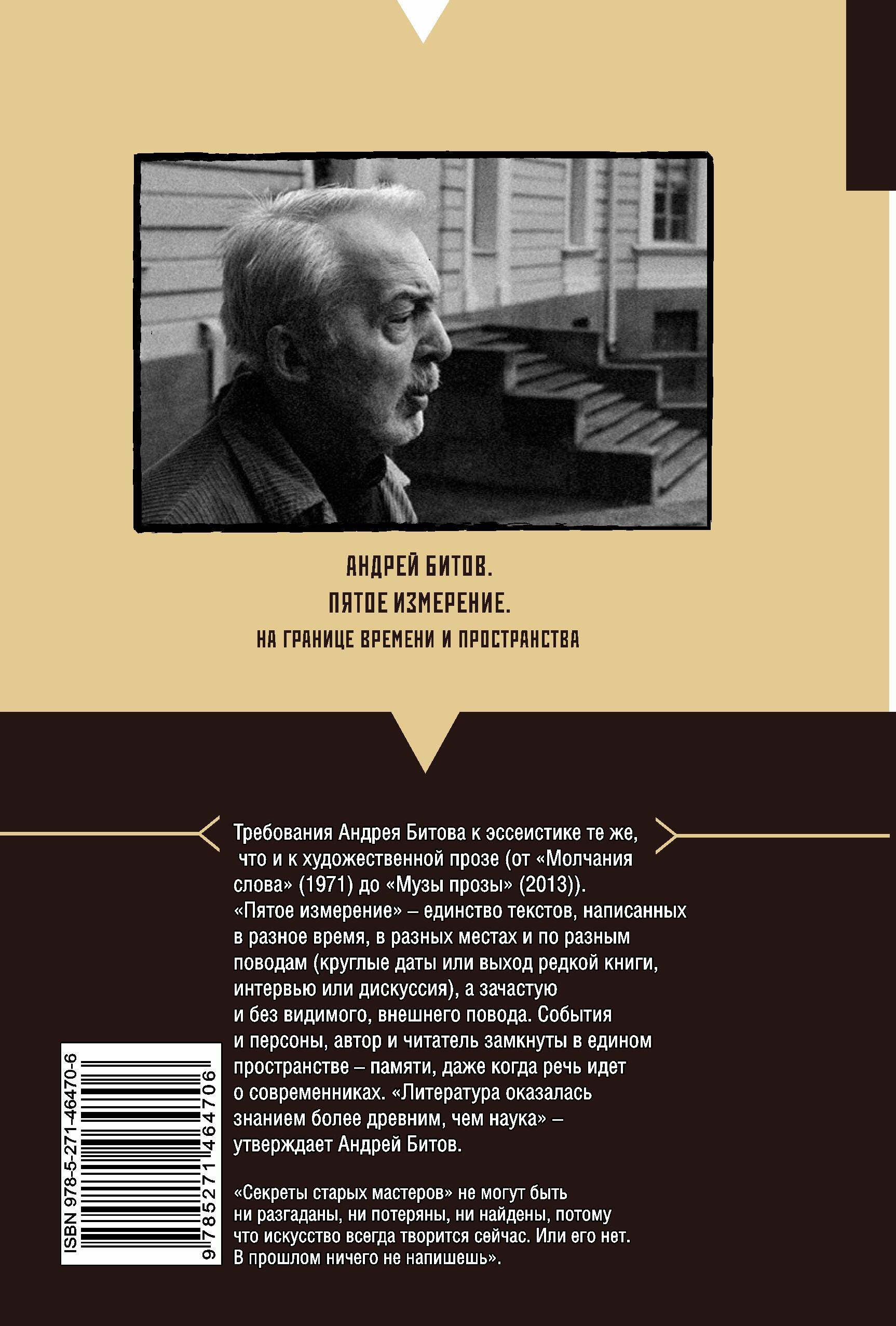 Требования Андрея Битова к эссеистике те же, что и к художественной прозе (от "Молчания слова" (1971) до "Музы прозы" (2013)). "Пятое измерение" - единство текстов, написанных в разное время, в разных местах и по разным поводам (круглые даты или выход редкой книги, интервью или дискуссия), а зачастую и без видимого, внешнего повода. События и персоны, автор и читатель замкнуты в едином пространстве - памяти, даже когда речь идет о современниках. "Литература оказалась знанием более древним, чем наука" - утверждает Андрей Битов.| Издательство | ИЗД-ВО "АСТРЕЛЬ" ООО |
