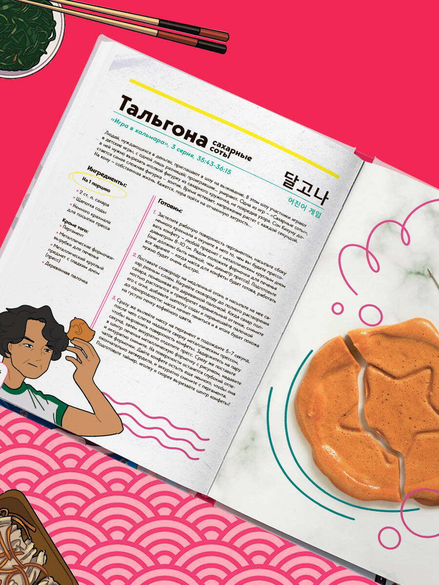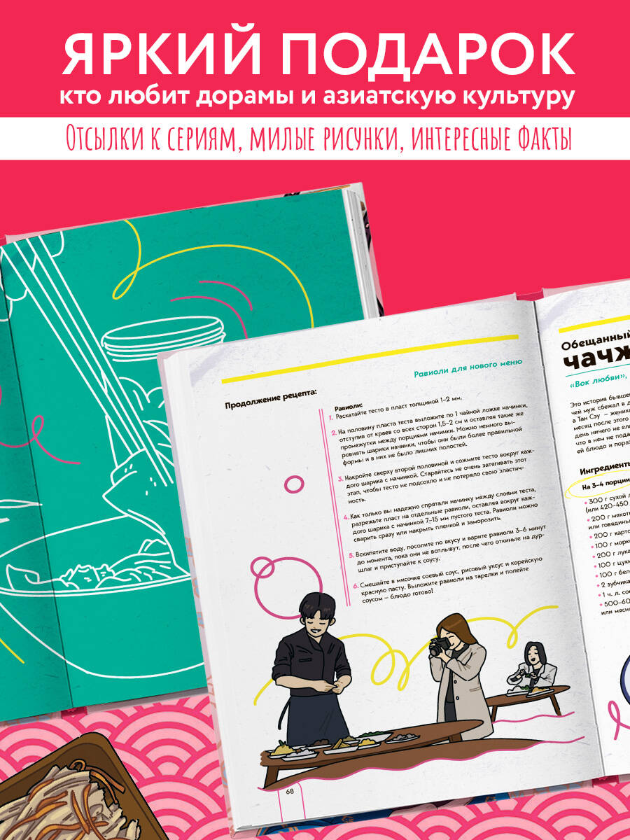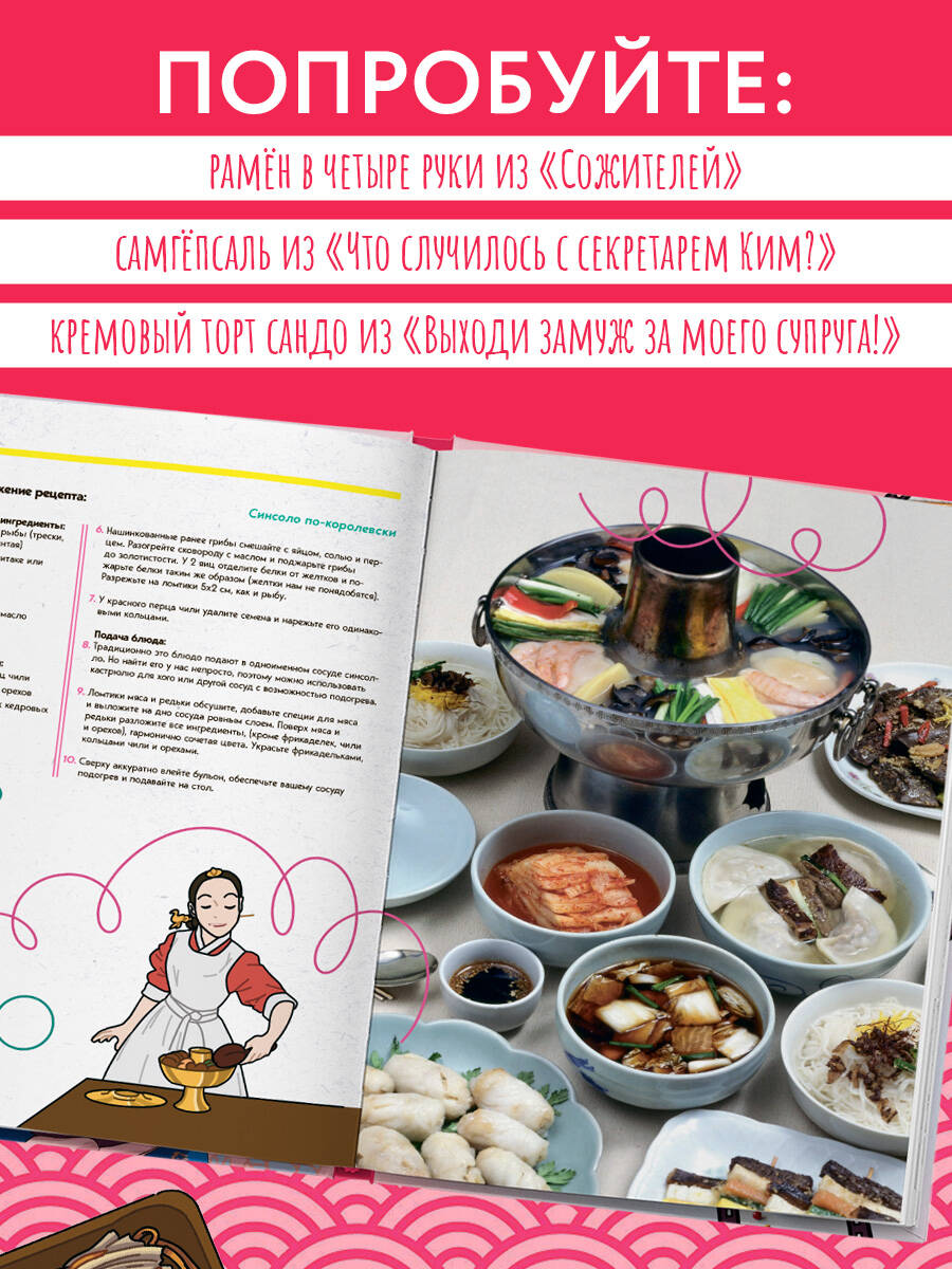 Снова смотрели взахлеб корейские дорамы и проголодались? Еще и герои опять уплетают что-то вкусное... Дайте голоду бой! И не стоит завидовать персонажам, ведь вы сможете приготовить те же блюда, что и они. Возьмите перерыв - и скорее на кухню! Вас ждут 37 рецептов из ваших любимых дорам: супы и лапша, горячее, закуски, сладости и напитки. - Приготовьте сытный суп сундэччигэ от Сэроя из «Итхэвон класса». - Разделите с подругами острую курочку в панировке, как фея тяжелой атлетики Ким Покчу. - Устройте домашнее барбекю с рецептом самгёпсаля из «Что случилось с секретарем Ким?». - Сделайте традиционное кимчхи из редьки, как в «Ответе в 1988». - Устройте соревнование с сахарными сотами тальгона, как в «Игре в кальмара» (только, пожалуйста, не на выживание!). - Сварите живительный напиток сучжонгва от хандры и простуды из «Королевы Чхорин». А еще к каждому рецепту есть таймкод с временем, когда блюдо появляется в дораме, так что сможете подготовиться к просмотру основательно и поужинать вместе с героями. Сделайте мир любимых дорам еще живее!| Издательство | ООО "Издательство "Эксмо" |