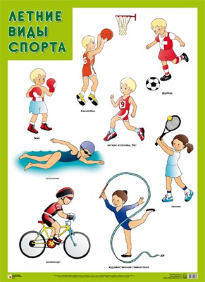 Этот плакат познакомит Вашего малыша с летними видами спорта: футболом, легкой атлетикой, теннисом, плаванием и др. Красочные иллюстрации помогут ребёнку легко и быстро изучить и запомнить названия летних видов спорта, спортивного инвентаря.